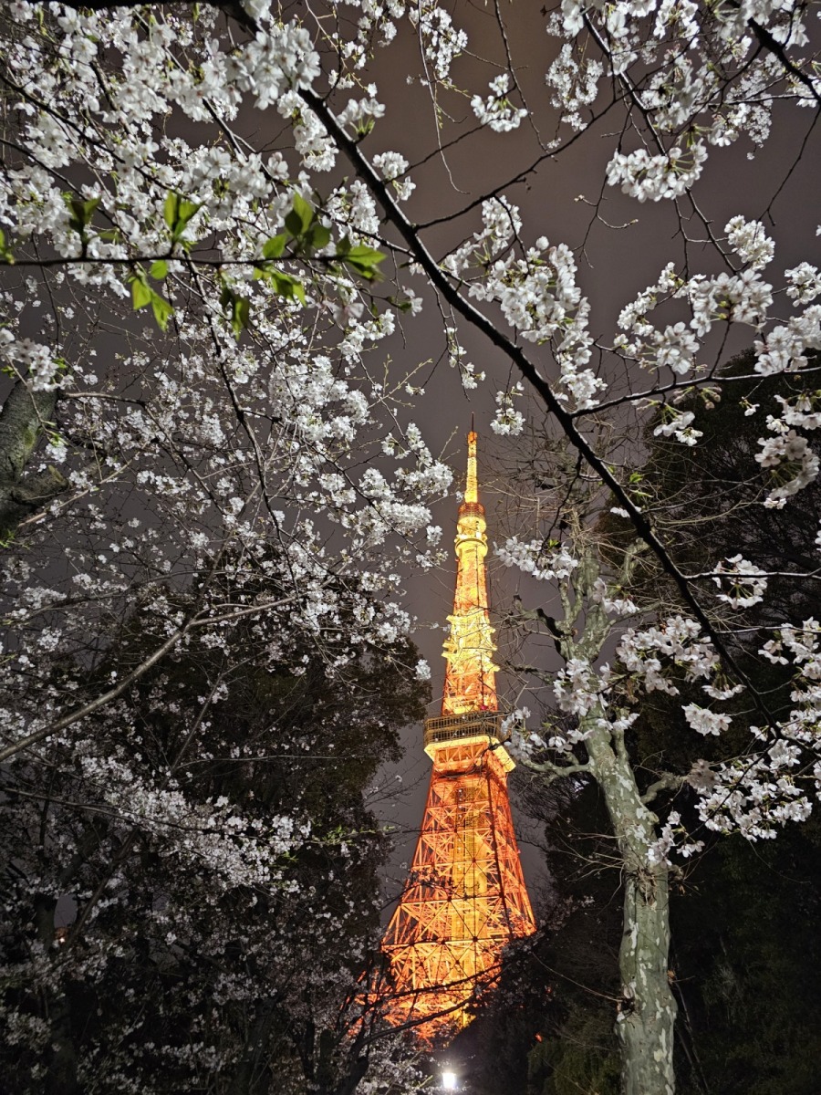 離開時也不忘回頭再拍一下點燈的東京鐵塔和櫻花的合照,不管來幾次,東京鐵塔依然充滿著魅力。