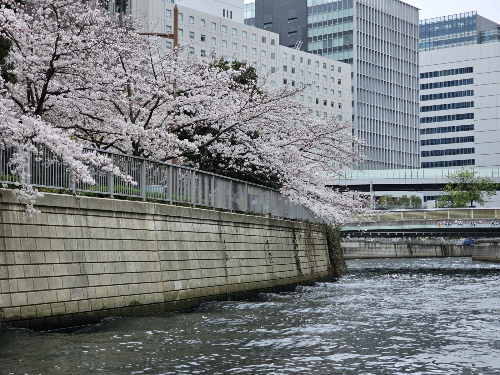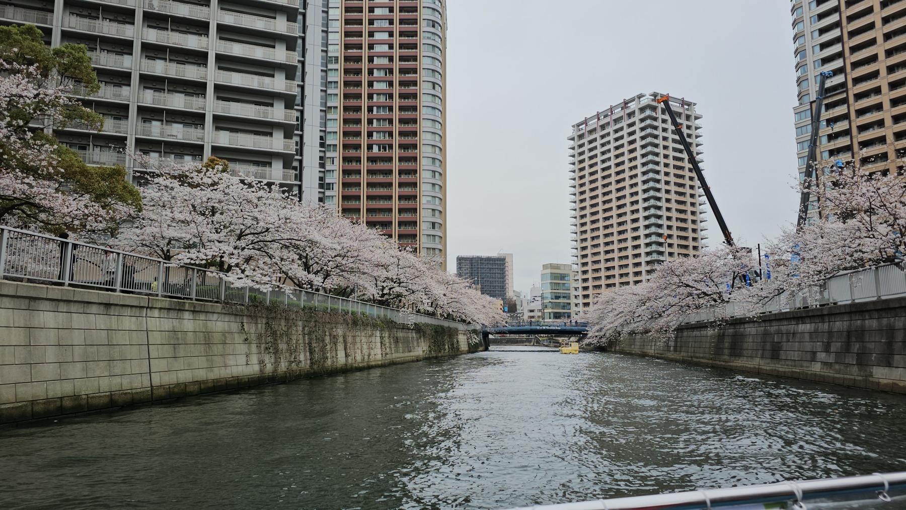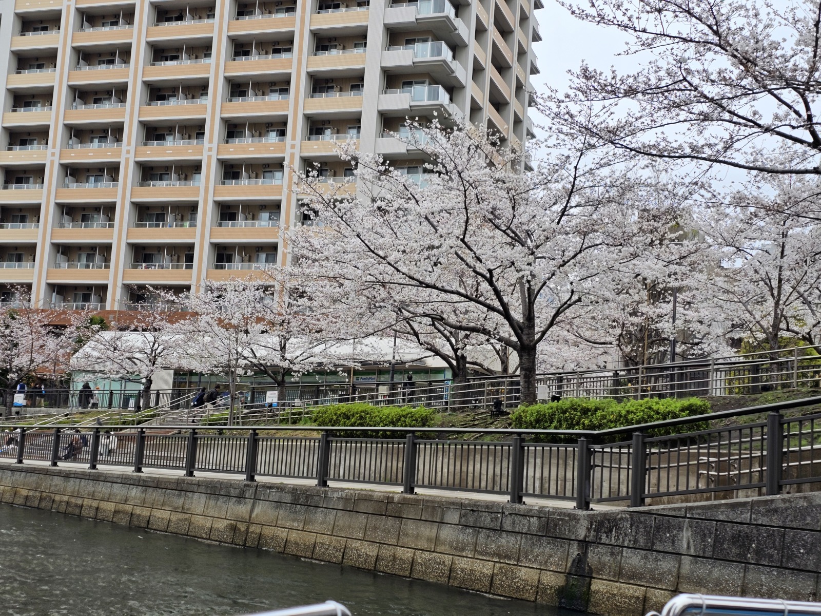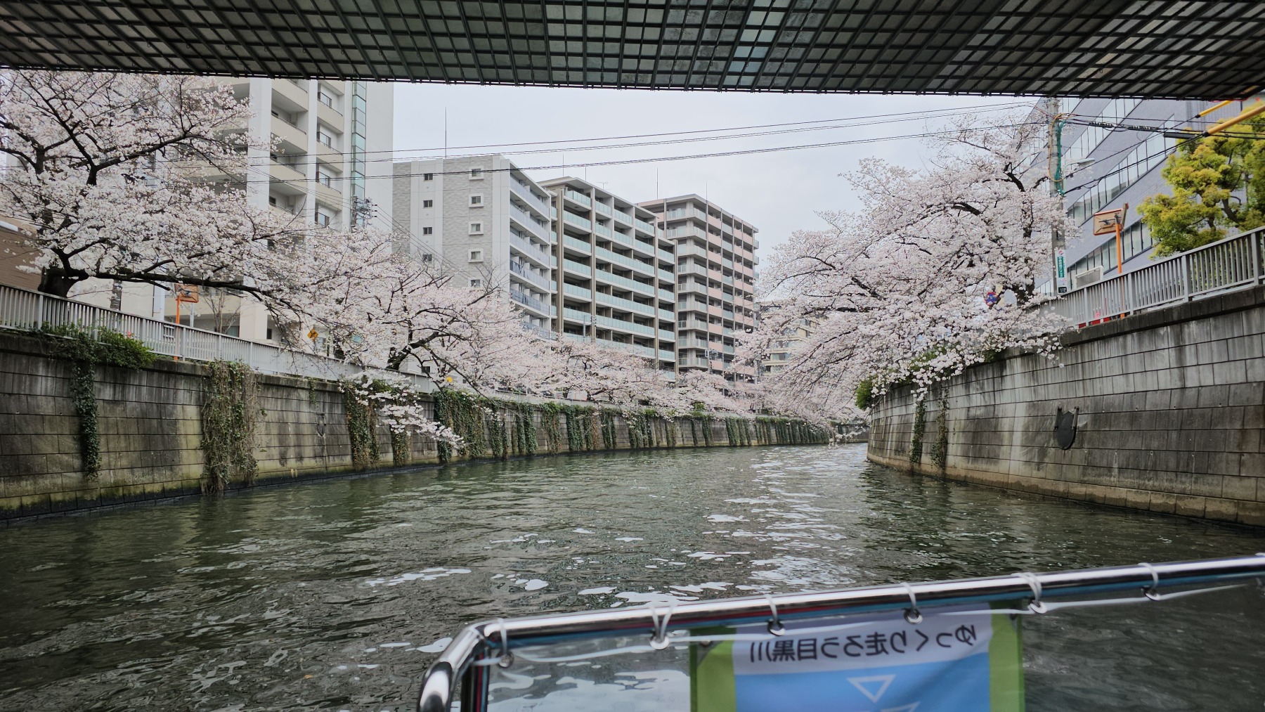 航程是從天王洲島旁邊的乘船處出發,沿著目黑川向上,到太鼓橋附近就折返,時間約一小時出頭,沒有開到中目黑去(好像也開不進去?),沿途兩岸都有種櫻花,雖然樹枝有朝河中延伸不過並不多,所以是著一小段距離在看,但有這麼多整齊又幾乎滿開的櫻花還是很興奮。船上也有船員負責解說,不過麥克風音量不大加上顧著看美景和拍照都來不及了,都沒有聽解說說了什麼。雖然沒有近距離看到櫻花,但搭船賞櫻實在是很難得的體驗,沿途滿開的櫻花也是很漂亮,有機會的話我覺得很值得嘗試。
