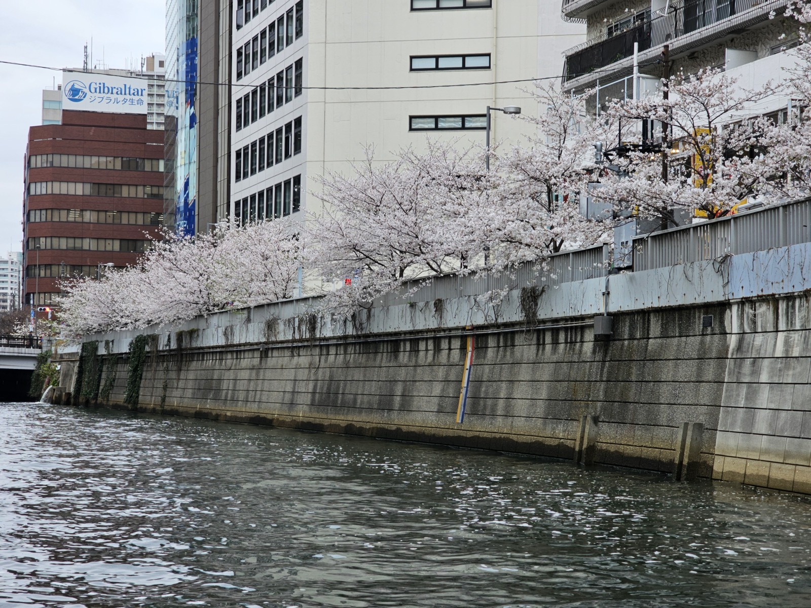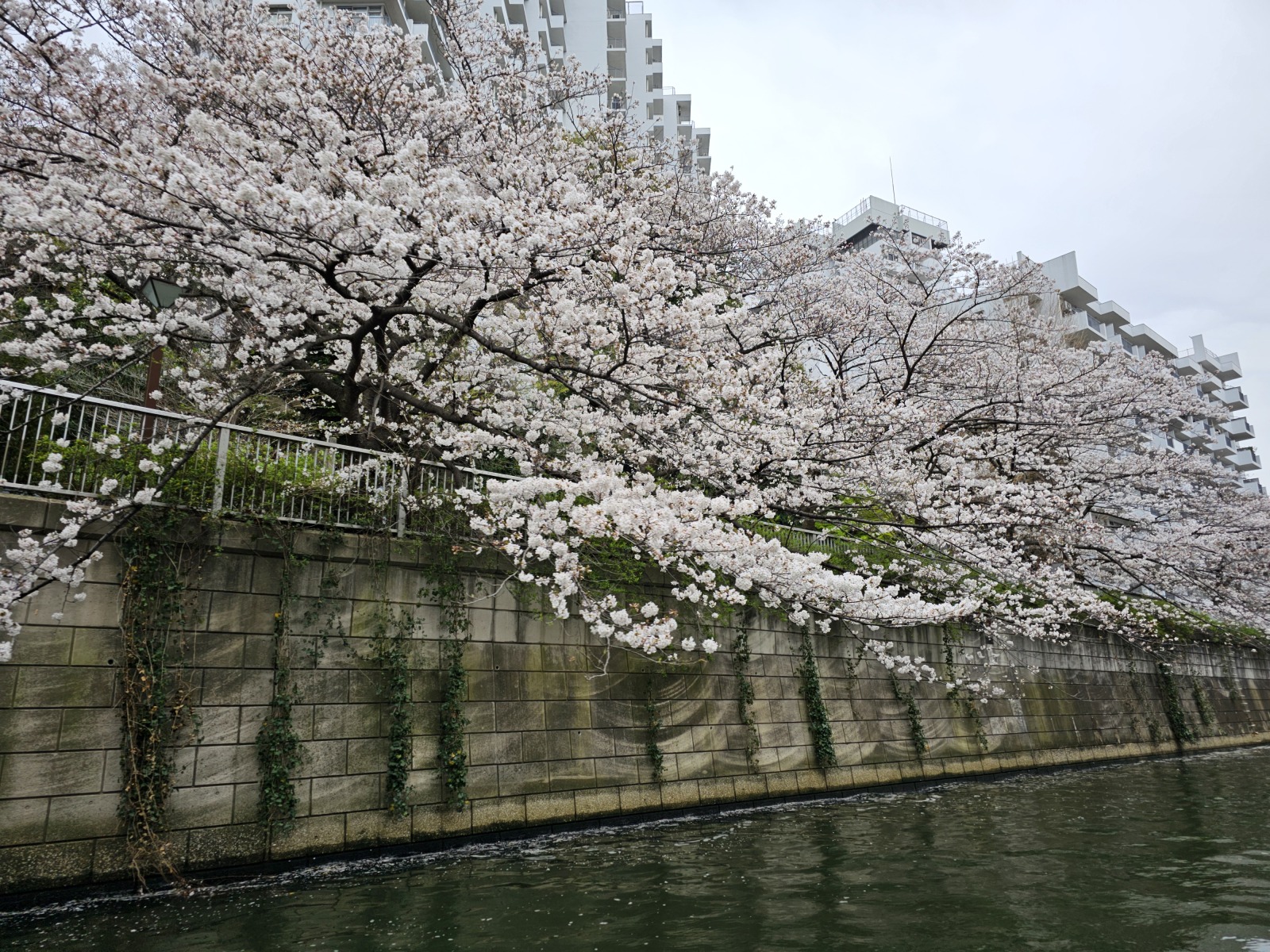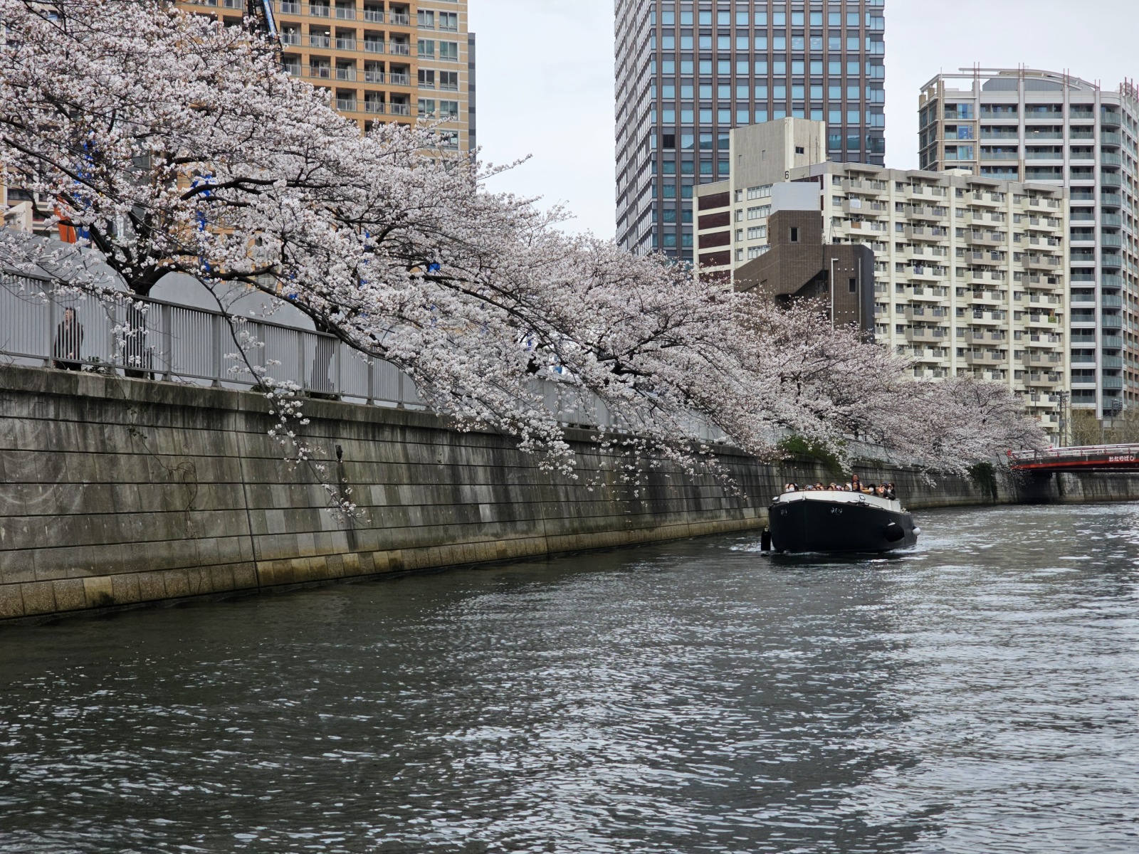 航程是從天王洲島旁邊的乘船處出發,沿著目黑川向上,到太鼓橋附近就折返,時間約一小時出頭,沒有開到中目黑去(好像也開不進去?),沿途兩岸都有種櫻花,雖然樹枝有朝河中延伸不過並不多,所以是著一小段距離在看,但有這麼多整齊又幾乎滿開的櫻花還是很興奮。船上也有船員負責解說,不過麥克風音量不大加上顧著看美景和拍照都來不及了,都沒有聽解說說了什麼。雖然沒有近距離看到櫻花,但搭船賞櫻實在是很難得的體驗,沿途滿開的櫻花也是很漂亮,有機會的話我覺得很值得嘗試。