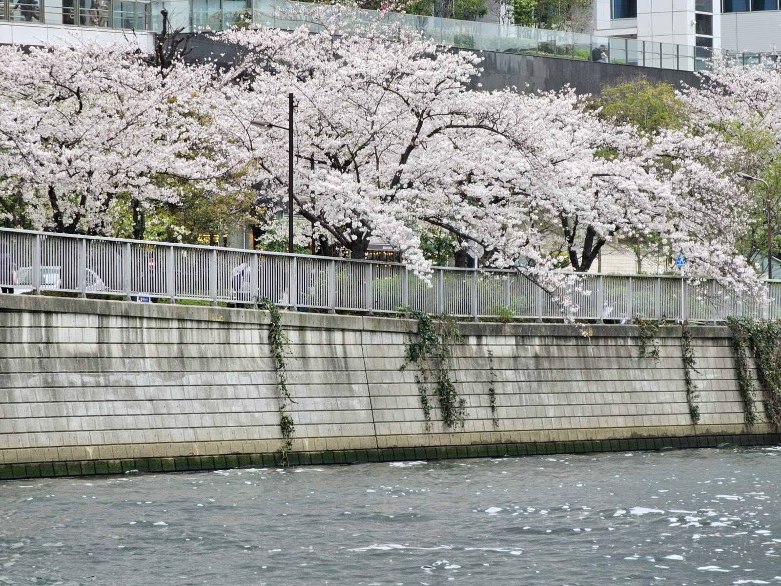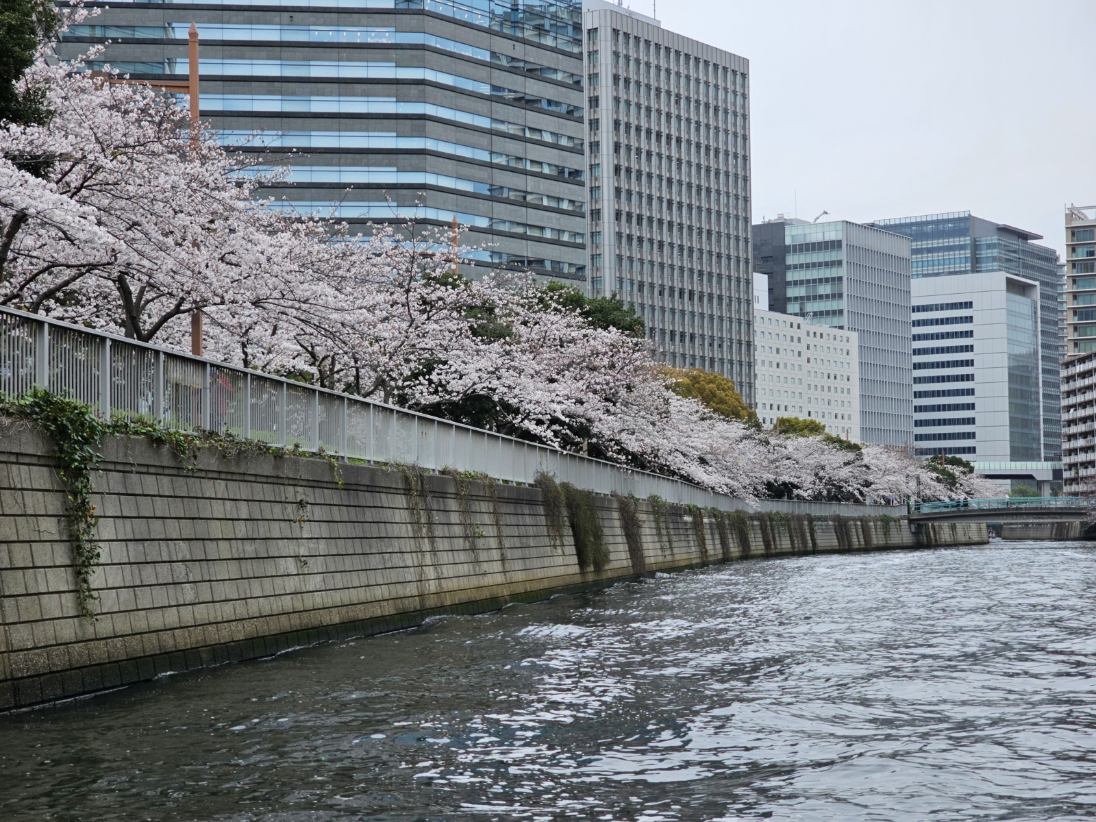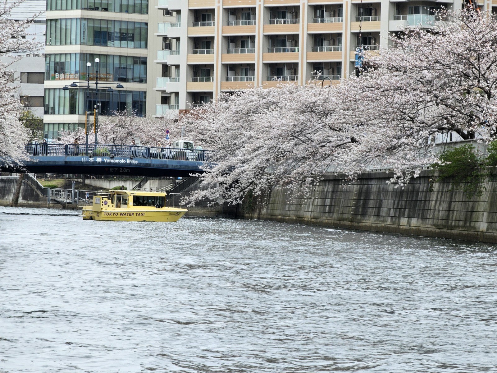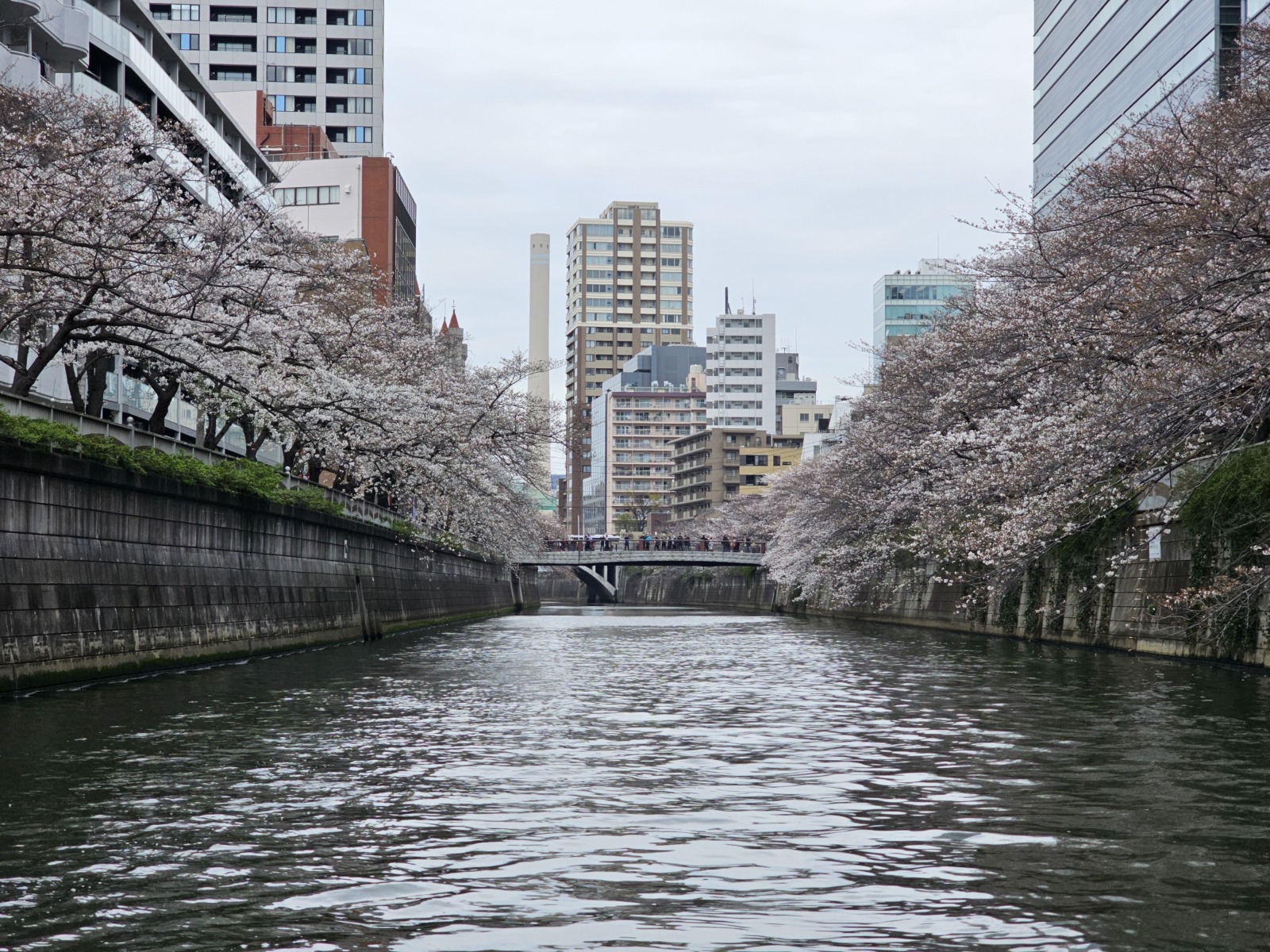 航程是從天王洲島旁邊的乘船處出發,沿著目黑川向上,到太鼓橋附近就折返,時間約一小時出頭,沒有開到中目黑去(好像也開不進去?),沿途兩岸都有種櫻花,雖然樹枝有朝河中延伸不過並不多,所以是著一小段距離在看,但有這麼多整齊又幾乎滿開的櫻花還是很興奮。船上也有船員負責解說,不過麥克風音量不大加上顧著看美景和拍照都來不及了,都沒有聽解說說了什麼。雖然沒有近距離看到櫻花,但搭船賞櫻實在是很難得的體驗,沿途滿開的櫻花也是很漂亮,有機會的話我覺得很值得嘗試。