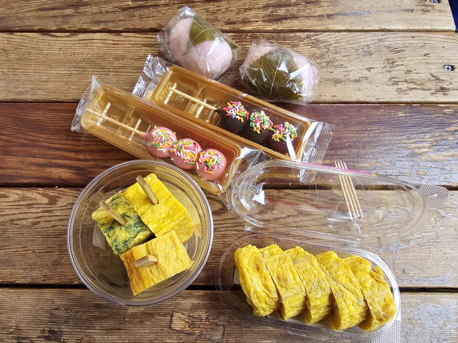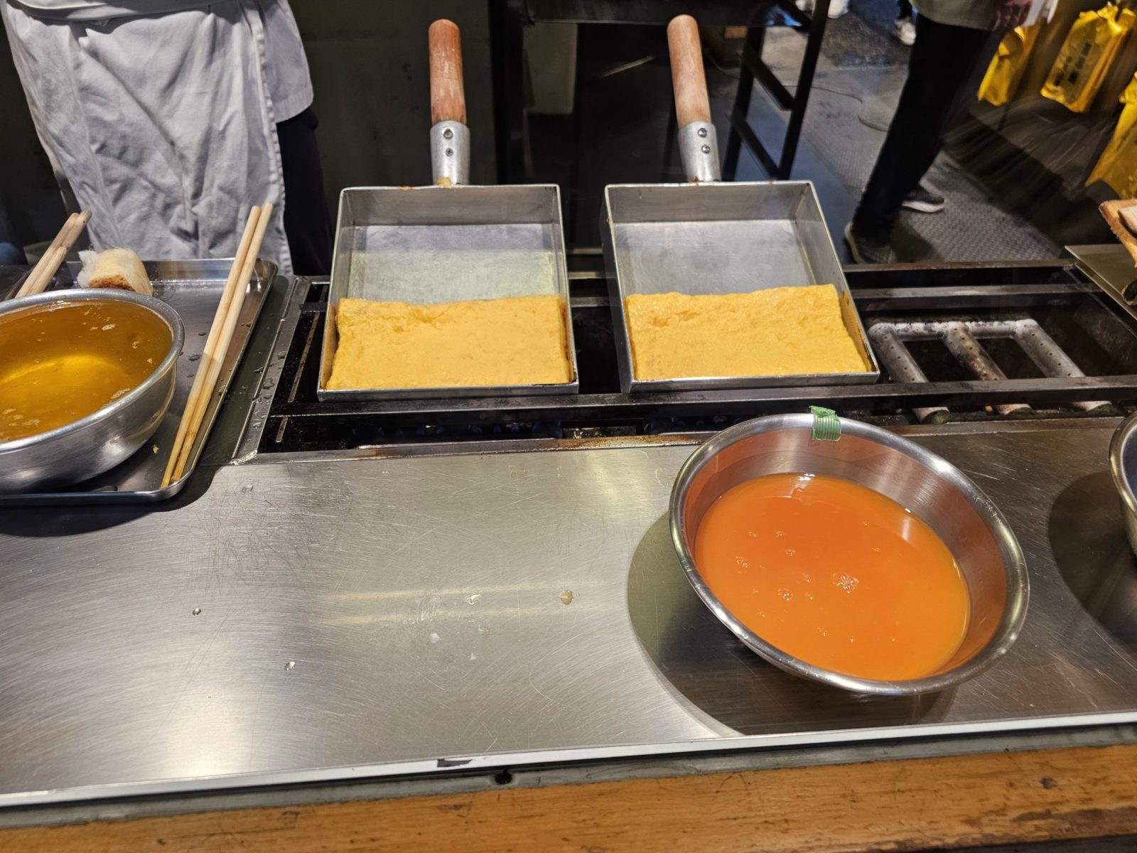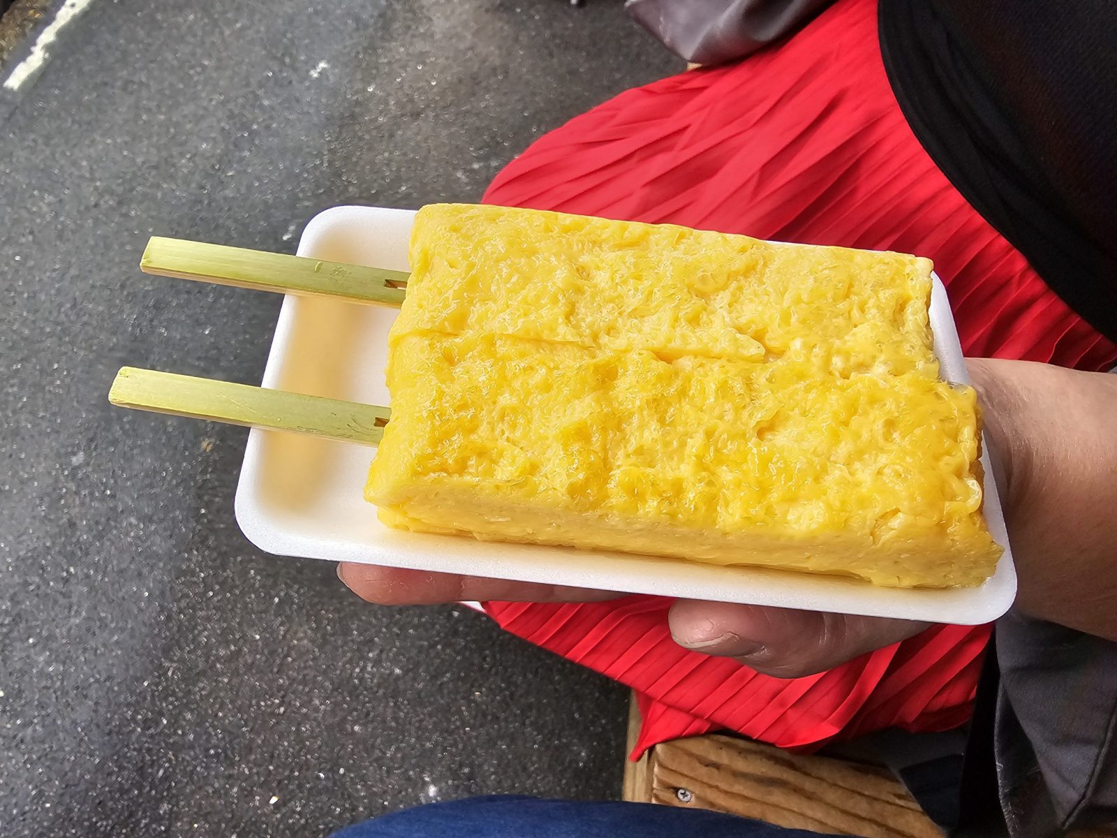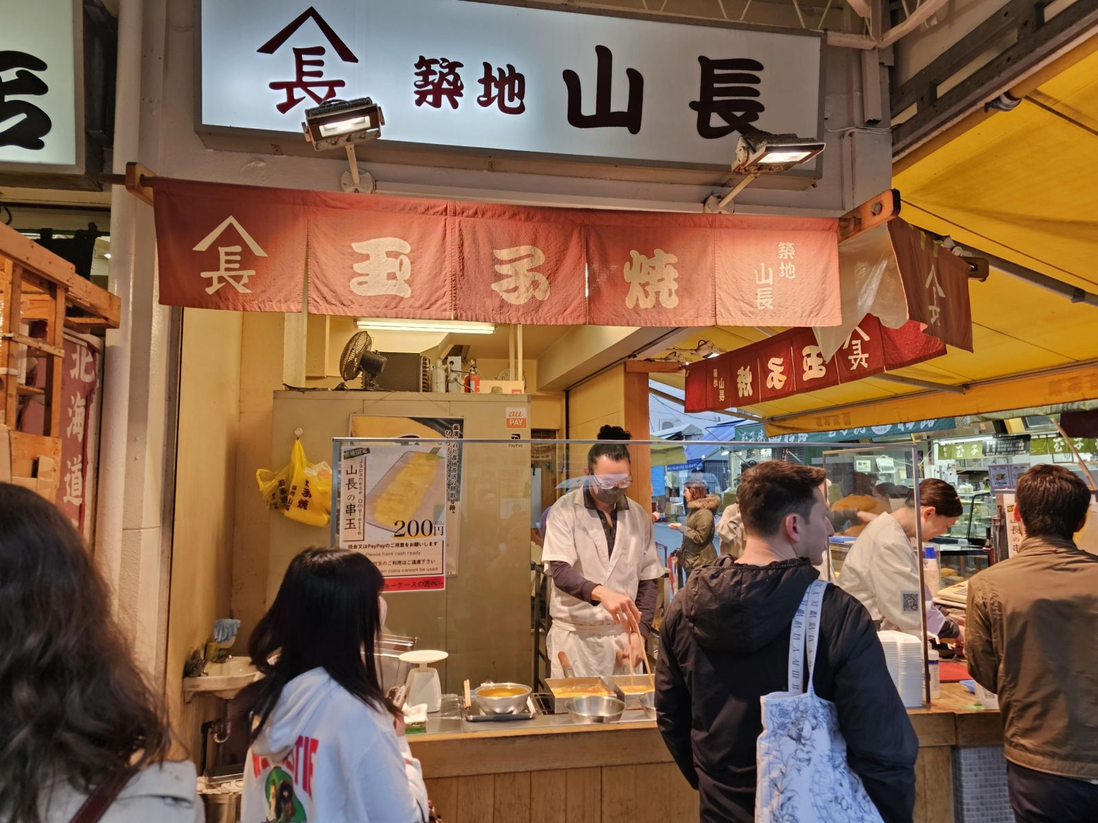 到了築地的時候差不多已經六點多了,正好是築地市場早開的店家開始營業的時間,原本飄著的小雨也停了,轉進場外市場就看到賣玉子燒的山長已經排了不少人,身為玉子燒控的我們也趕快加入隊伍各買了一支來吃,天冷的時候吃著熱呼呼的玉子燒實在太幸福了,吃完後覺得不過癮,又到旁邊的玉子燒店家買冷藏的其他口味玉子燒和櫻餅等小點心來吃,每個都很好吃,尤其是櫻餅外Q內餡又不會太甜。這邊還發生了個哀傷的小插曲,大姊買了一盒鮪魚中腹握壽司要分著吃,打開的時候沒放穩還沒吃到就整盒掉到地上請地板吃了QQ,大姊為此懊惱了好久。