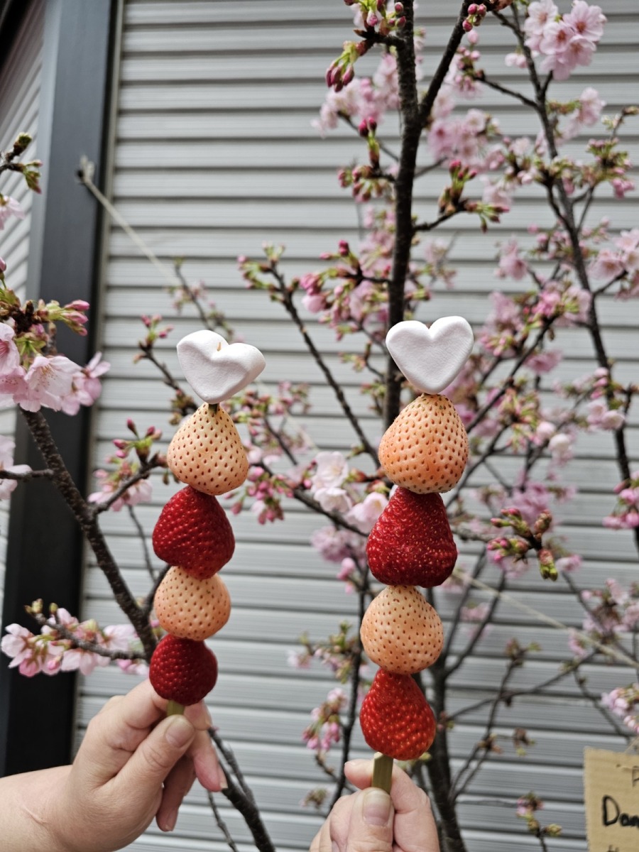 享用完美味的玉子燒和櫻餅之後,就繼續逛築地市場,路上看到了整盒的草莓,有紅有白,家人沒吃過白草莓很有興趣,但是因為買了沒地方洗來吃只好作罷。不過之後走一走遇到直接賣整串的草莓攤,雖然價格跟盒裝的比起來貴了不少,為了嘗鮮還是買了兩串來分,吃完大家都同意還是紅色草莓比較香,白草莓雖然比較甜但是少了酸味和草莓特有的香氣就沒那麼好吃。