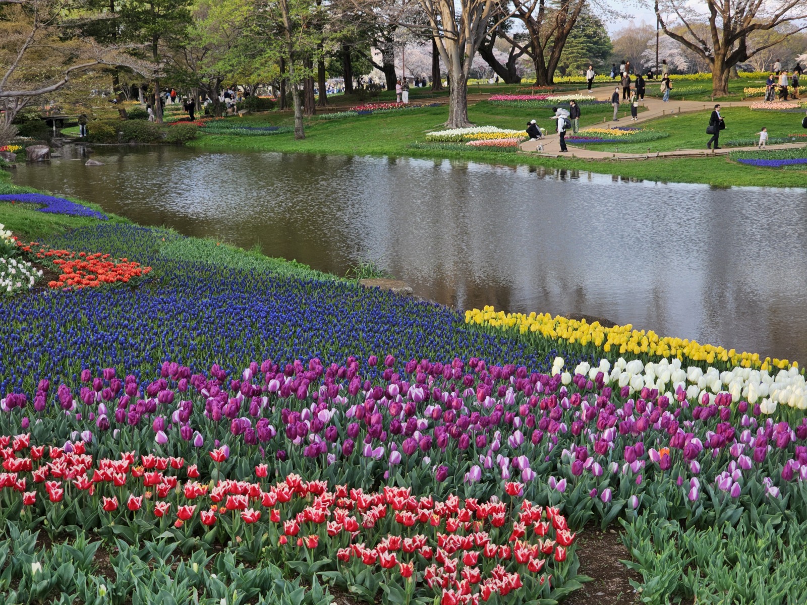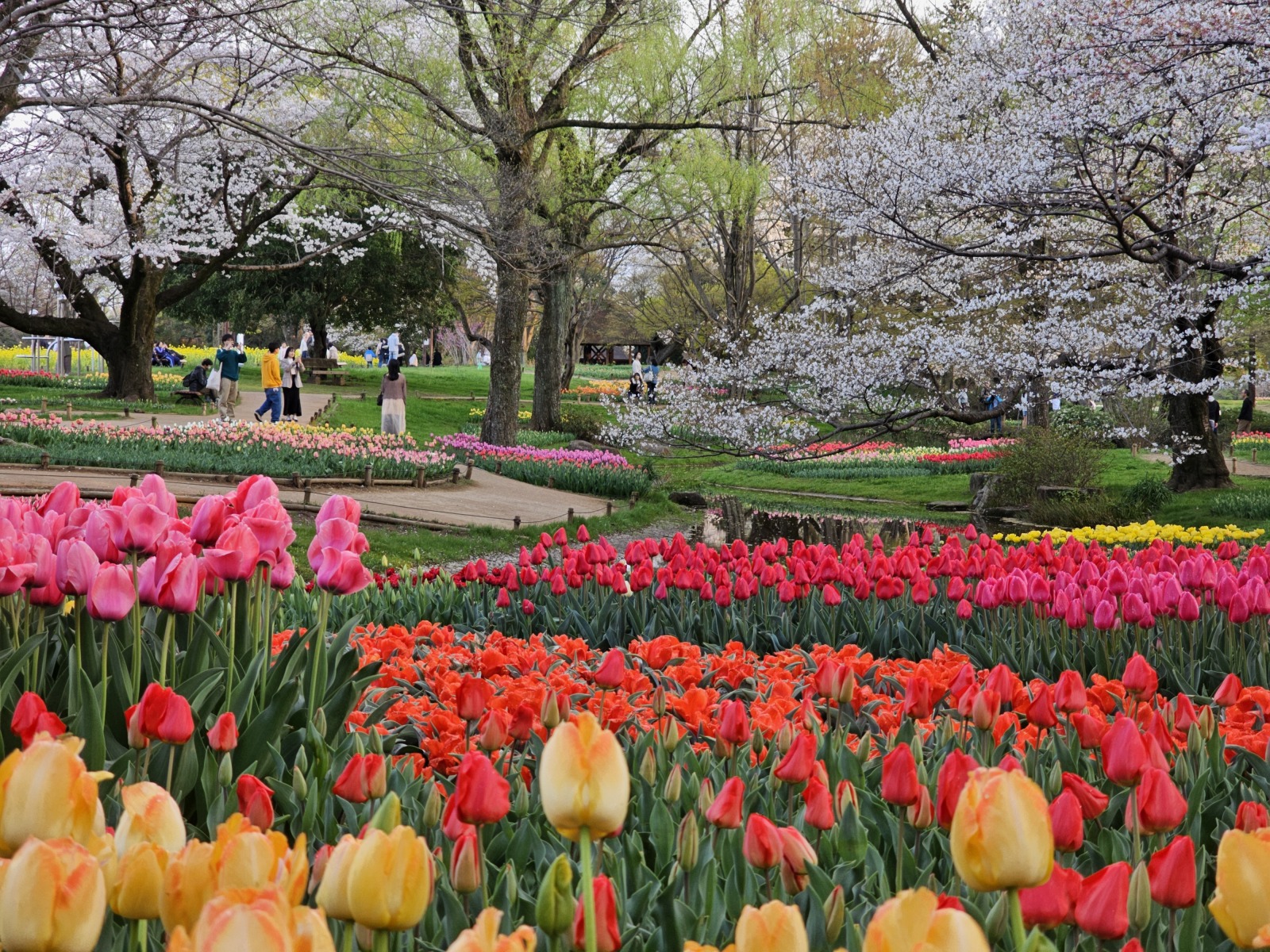 溪流廣場旁邊還有片油菜花海,往更裡面看過去可以看到還有一大片櫻花樹,可惜的是我們前面賞櫻和休息吃東西花了不少時間,來到溪流廣場的時候已經是五點多,昭和紀念公園假日是六點閉園,看完鬱金香後已經沒時間再往更裡面走,算是這次比較可惜的地方。昭和紀念公園實在是很大,要來的話還是至少安排半天以上到一天的時間才逛得完。