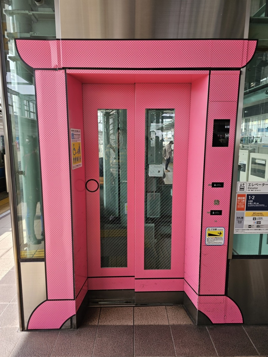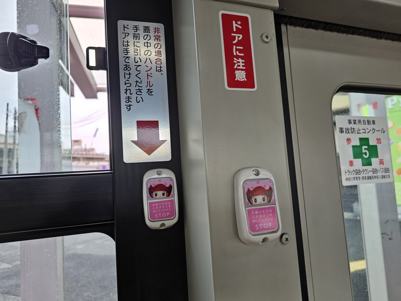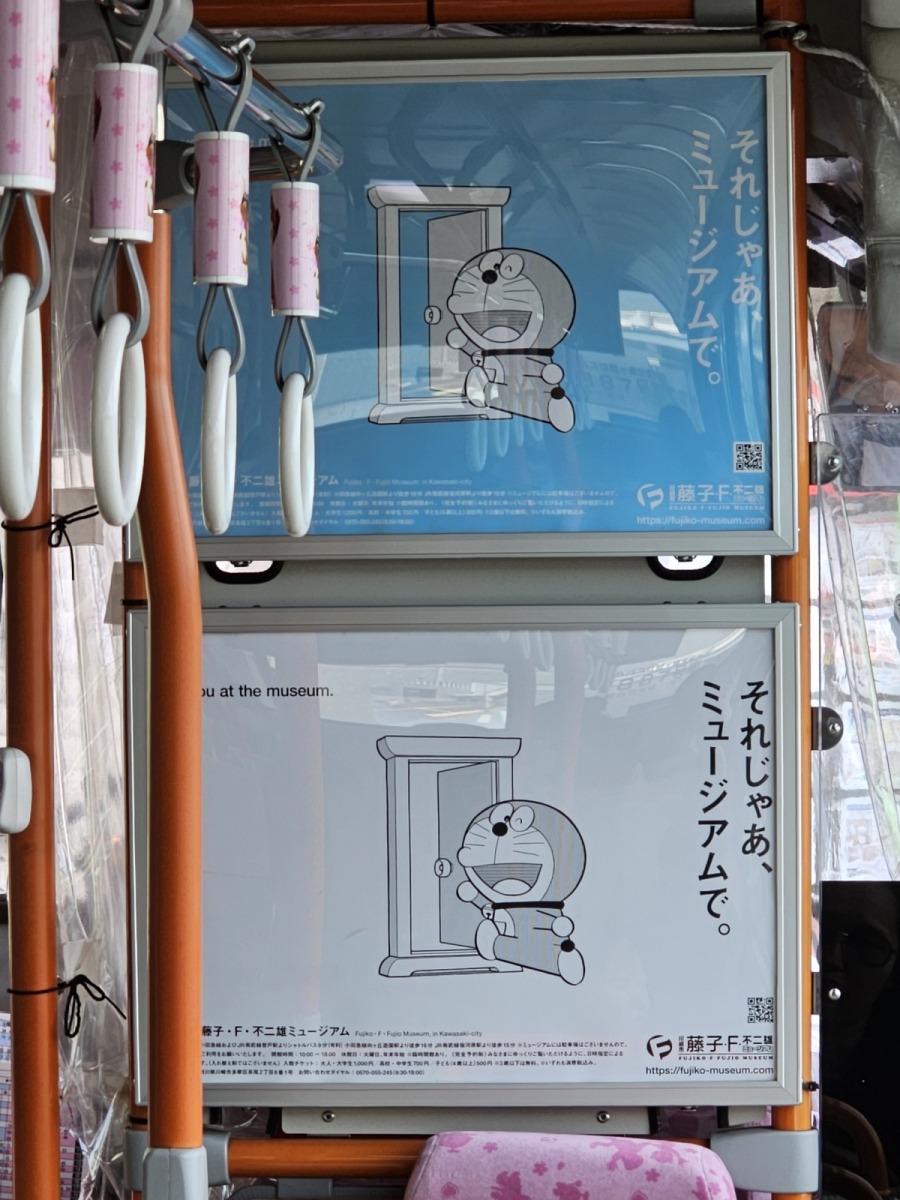 今天的首站是位在登戶的藤子不二雄博物館,從上野搭山手線到新宿後轉小田急小田原線就可以到達登戶,一下車從站牌名稱就看得出哆啦A夢的特徵,連電梯門都做成任意門造型,沿著指示出站後就能到搭免費接駁車的地方,接駁車不管車內外也都滿滿都是跟藤子不二雄的作品相關的角色,讓喜歡哆啦A夢的二姊還沒到博物館就心花怒放。