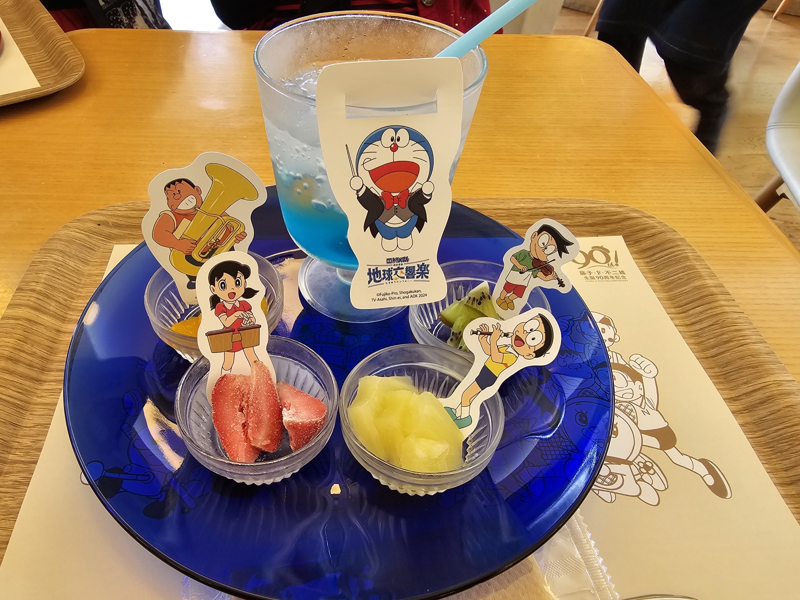 藤子不二雄博物館的餐廳菜單會隨著時間更新,所以跟各網誌看到的內容可能會不太一樣,這次去剛好遇到哆啦A夢新劇場版上映,所以菜單裡也有對應的飲料,汽水加上四種果乾,附上主角五人組的牌子。應該是有考慮到果乾已經有甜,汽水的部分不會太甜,喝起來相當清爽。