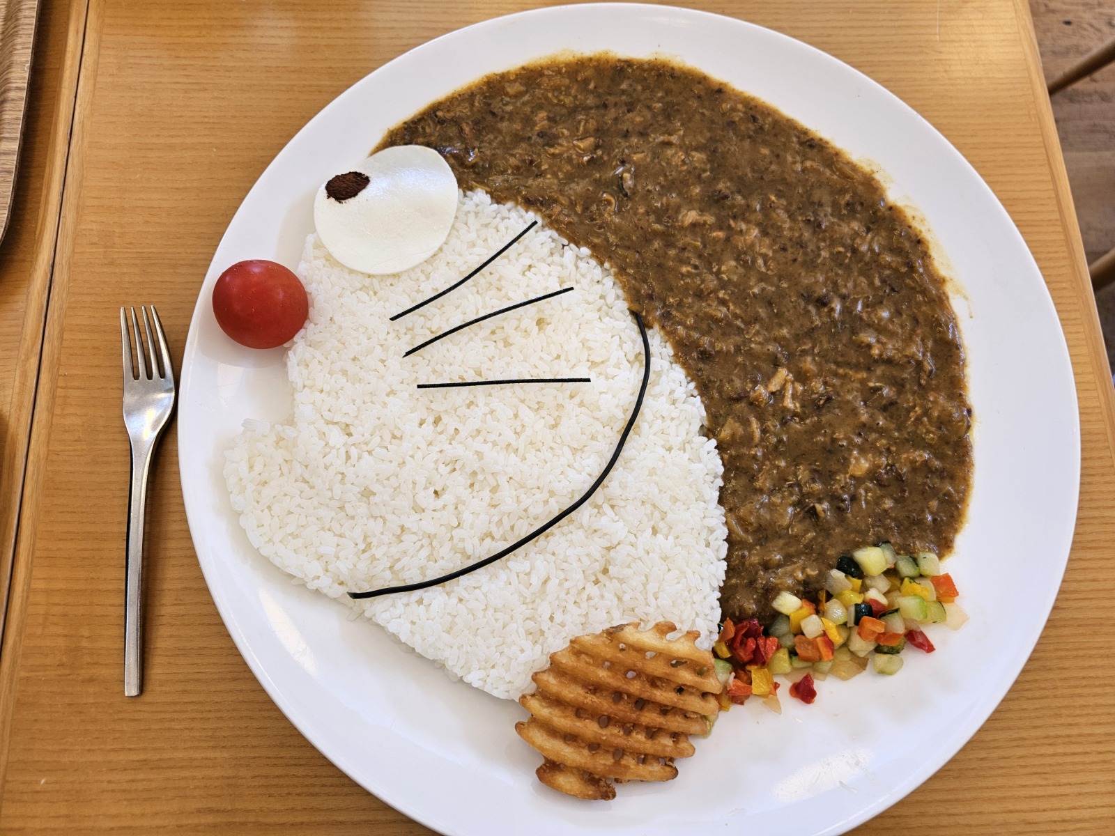 這次最有特色的就是超大盤的哆啦A夢肉醬咖哩,據說盤子的圓周長是129公分,同時也是哆啦A夢的體重、身高、頭圍等數值,把正常大小的叉子放在旁邊一比就看得出盤子有多大,一端上桌直接把一張雙人桌給佔住。味道則是中規中矩,不過這種主題餐廳只要不要做得難吃我覺得就可以給高分了。