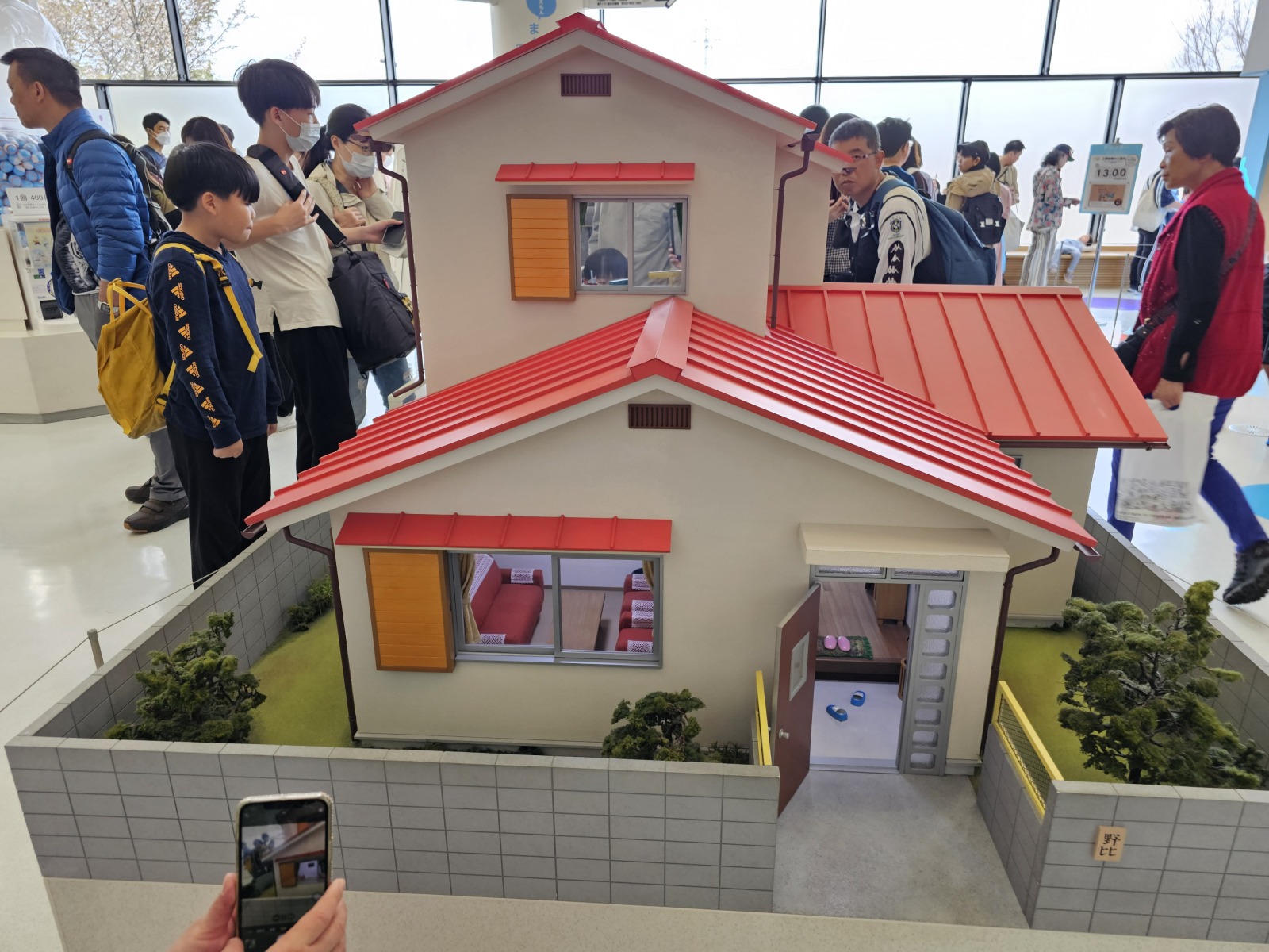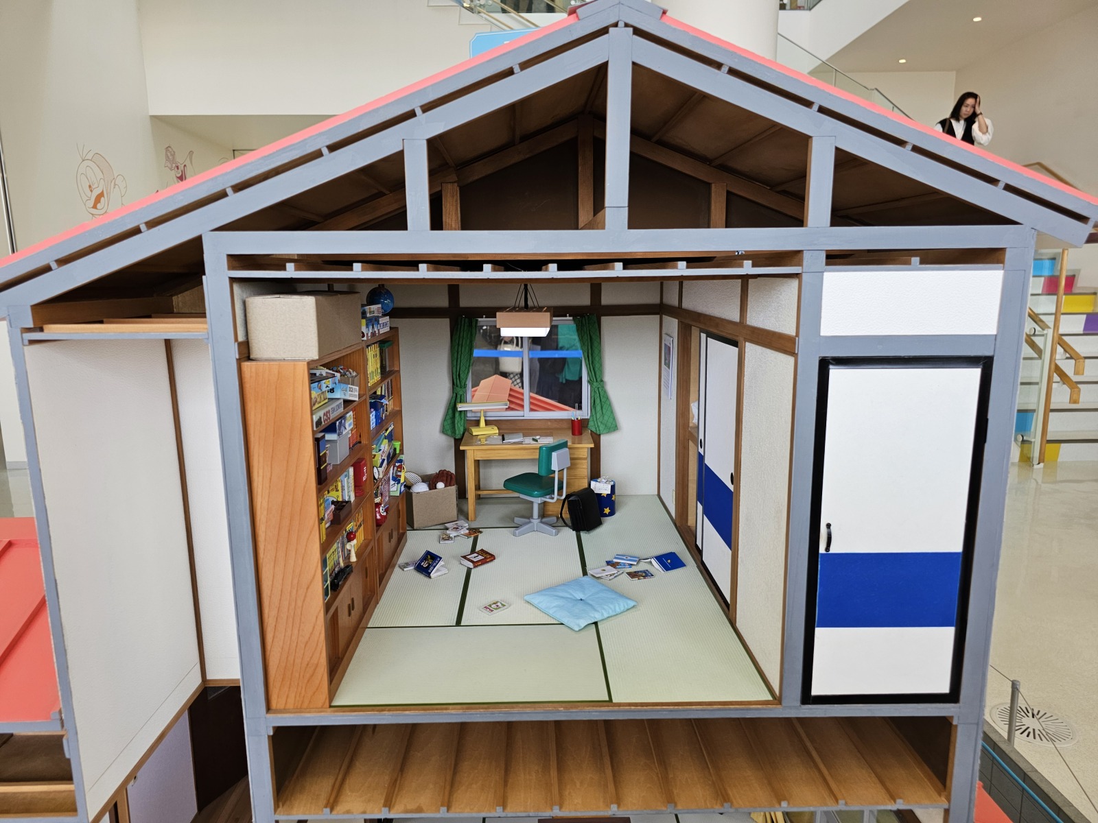 吃飽喝足後繼續逛博物館,一樓區域主要是藤子不二雄老師的手稿和漫畫展示,二樓比較偏向親子區,有地方可以讓小朋友玩,有漫畫看,可以做特色印章,還有一個大雄家的縮小模型,可以還能看到房子裡的配置,旁邊還有放平板讓大家可以用AR看房子的人物互動。另外有個小電影院區域可以看短片,入場的時候還要拿出進博物館的時候發的電影票給工作人員剪票,相當有儀式感。短片裡把藤子不二雄老師的作品角色集結起來,滿有趣的,看完後布幕拉起來,布幕後面直接就是出口,出去後可以直接接上三樓的樓梯,在動線規劃這塊也是相當用心,不過因為我們是跟大家反方向走,所以看完就下一樓去了。