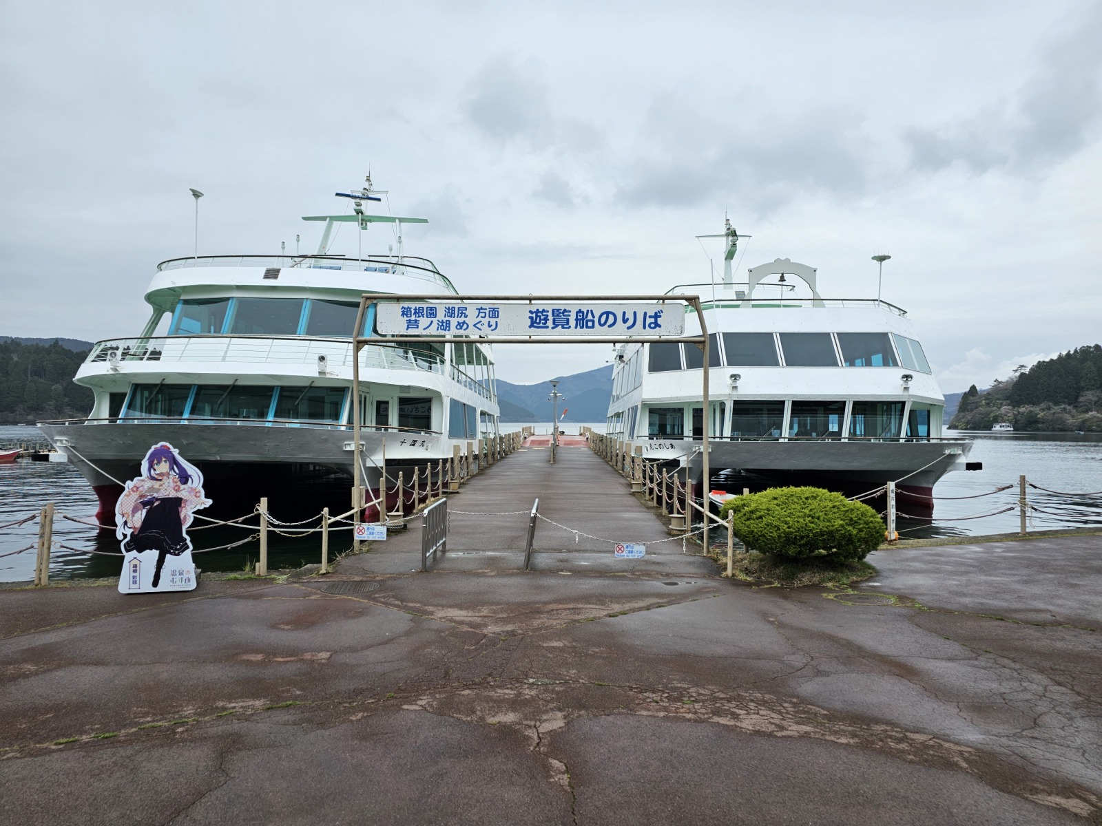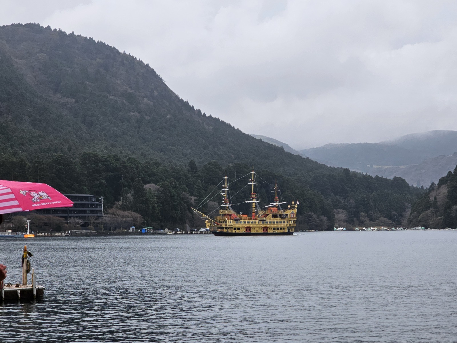 在箱根關所附近發現了個不小的免費停車場,停進去後看是箱根關所旅物語館的停車場,裡面有餐廳和名產&紀念品店,還有蘆之湖遊覽船的搭乘處(非有名的箱根海盜船)。在湖邊稍微逛一下後,因為兩位姊姊明天就要回台灣,考慮到機場免稅店的名產可能會沒有比較當地的名產,所以決定在這邊就先買一些比較有特色的名產,買完之後時間也不早了,雨也愈來愈大,為了趕回東京的高速巴士,就回頭去還車了。