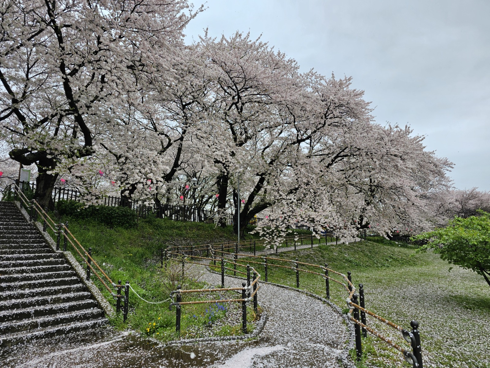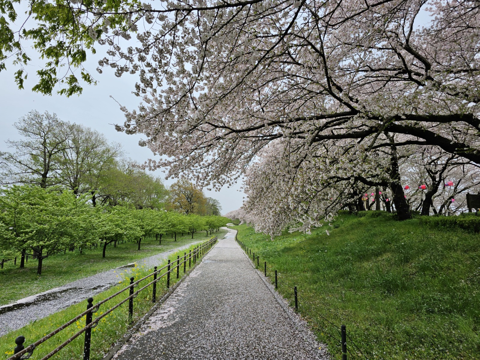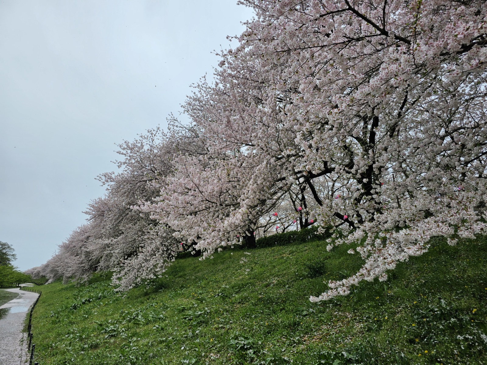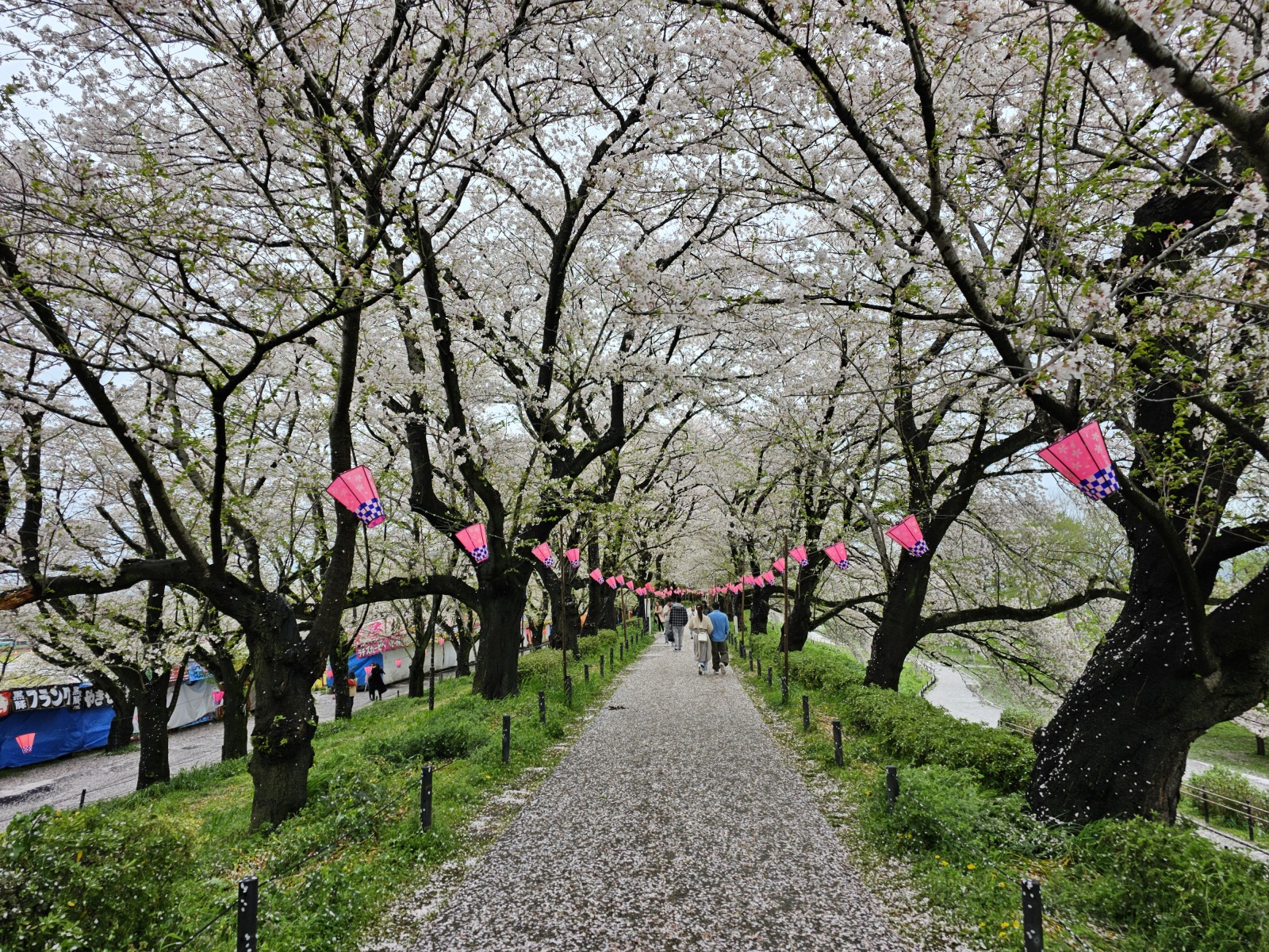 這區的堤防上整排兩邊都種滿了櫻花,因為已經滿開了一段時間,整片櫻花已經開始飄落花瓣,雖然看起來跟之前看到的滿開櫻花比開始有點稀落,但剛好今天風很大,風颳起來的時候大量花瓣飄落的樣子真的是名副其實的櫻吹雪,美麗的樣子讓我們不但照片拍不停,連錄影都錄了好久才滿足。