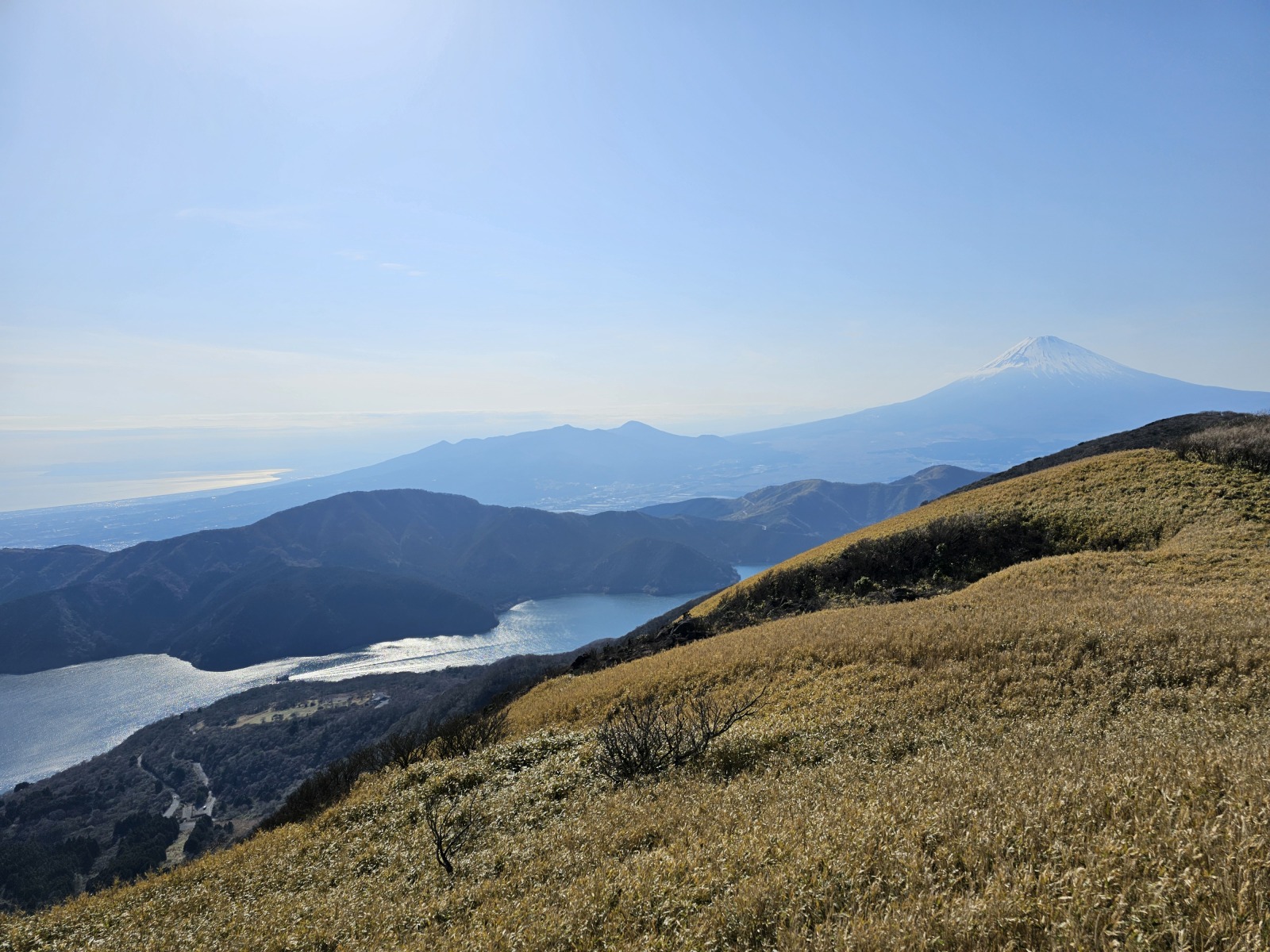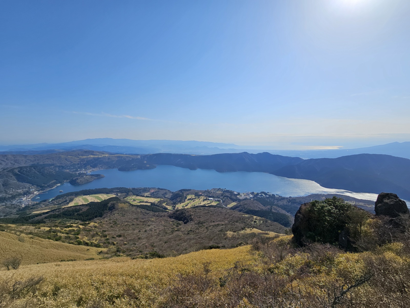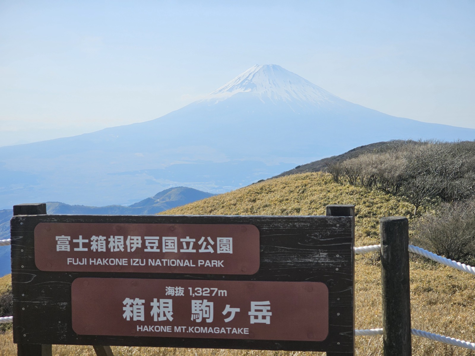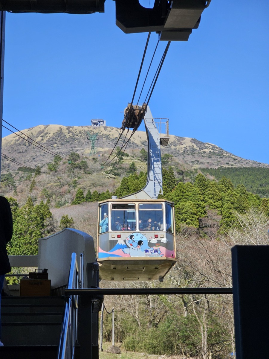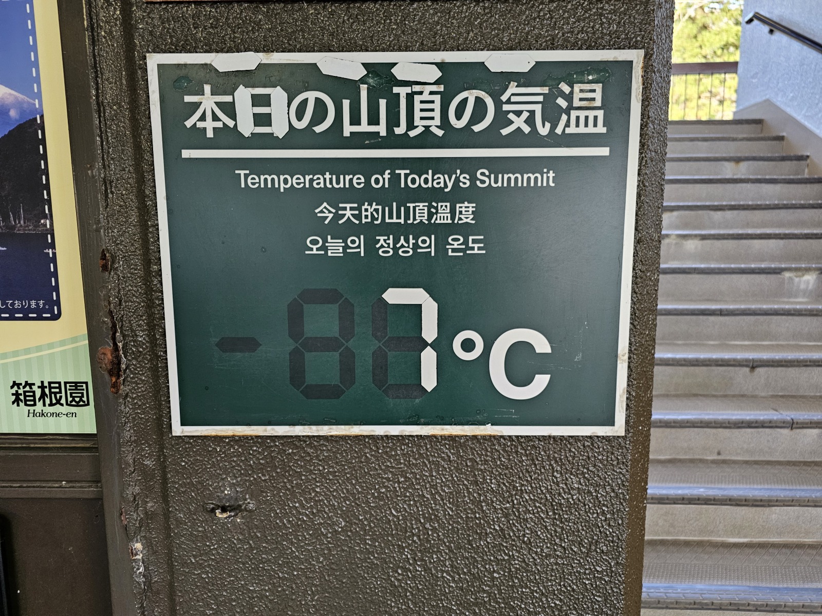 到了山上之後視野整個遼闊開來,在底下看不到的富士山,山頂可以清楚的看到富士山整體。朝西看有富士山、蘆之湖和駿河灣,朝東可以看到相模灣,整個周邊的美景盡收眼底。但是如同底下纜車站所寫的,山頂溫度只有7度,雖然今天出大太陽,可是山頂的風吹來還是非常的冷,身上衣物不夠厚的我們只好趕快動起來前往箱根元宮讓身體暖起來。