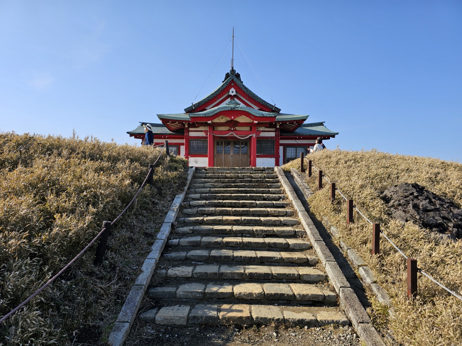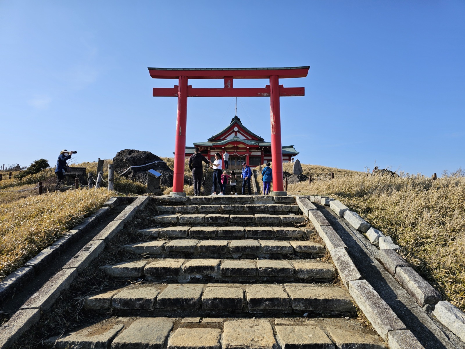 從纜車站有兩條路可以往箱根元宮,一條主要是樓梯,一條比較多石頭和碎石,我們走主要是樓梯的路,同時也是箱根元宮的正面道路。箱根元宮每年只有特定時間會有神職人員在,其他時候都是無人的神社,主要建築也只有鳥居和本殿,很快就能逛完。