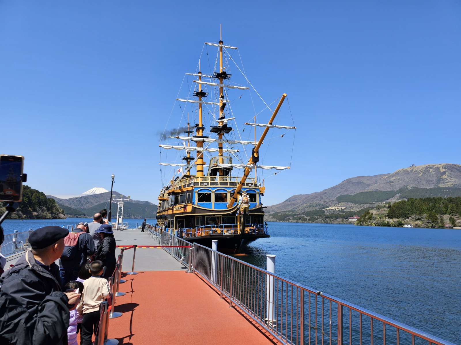 離開三島天空步道後,下一個目的地是來蘆之湖搭海盜船,拜4/8已經先租車來過一次的福,對蘆之湖旁邊的路有印象,很快就找到正確的地方。這次是從箱根町港出發,買來回票可以繞蘆之湖一圈再回來,中途停靠的港都能自由下船。