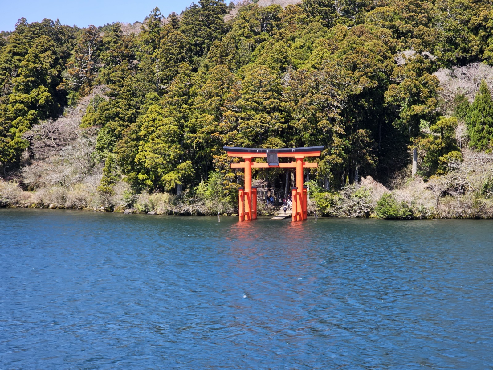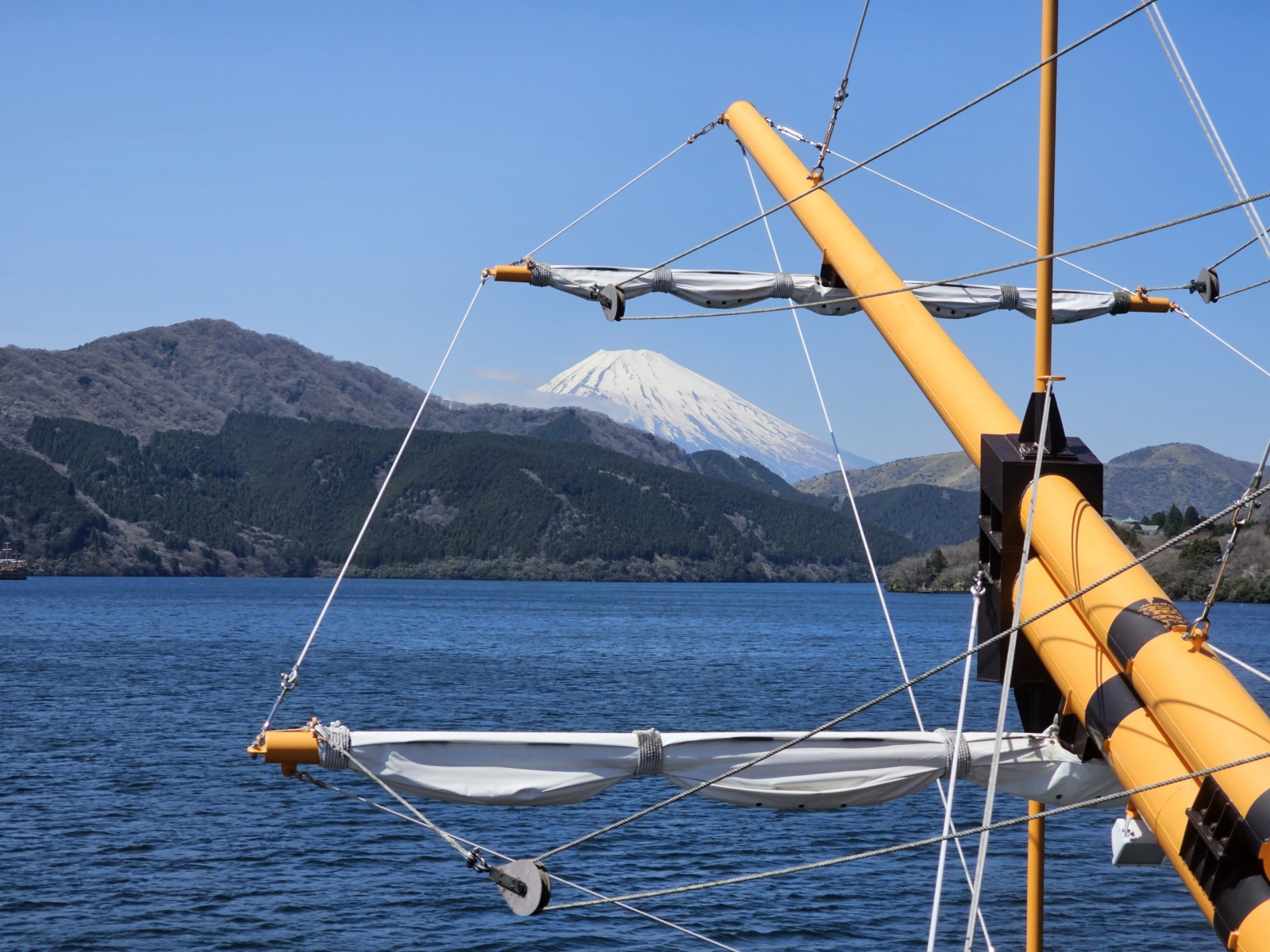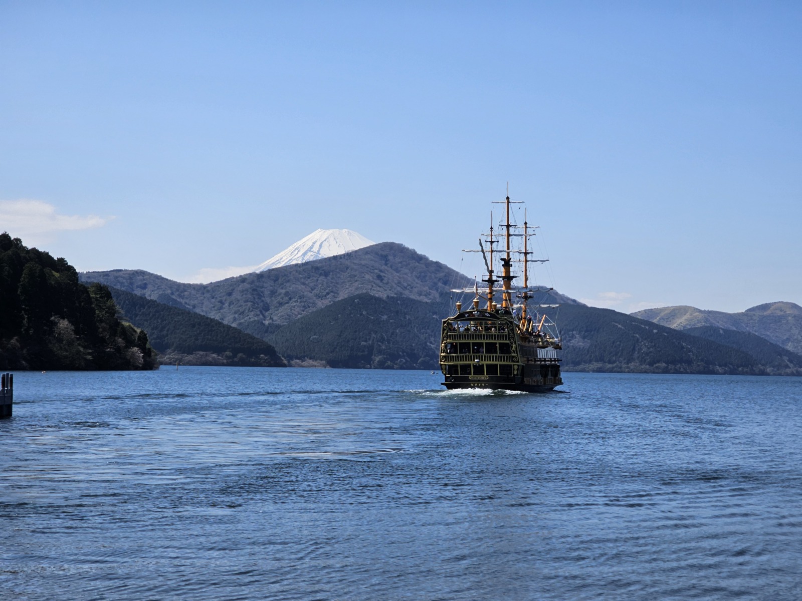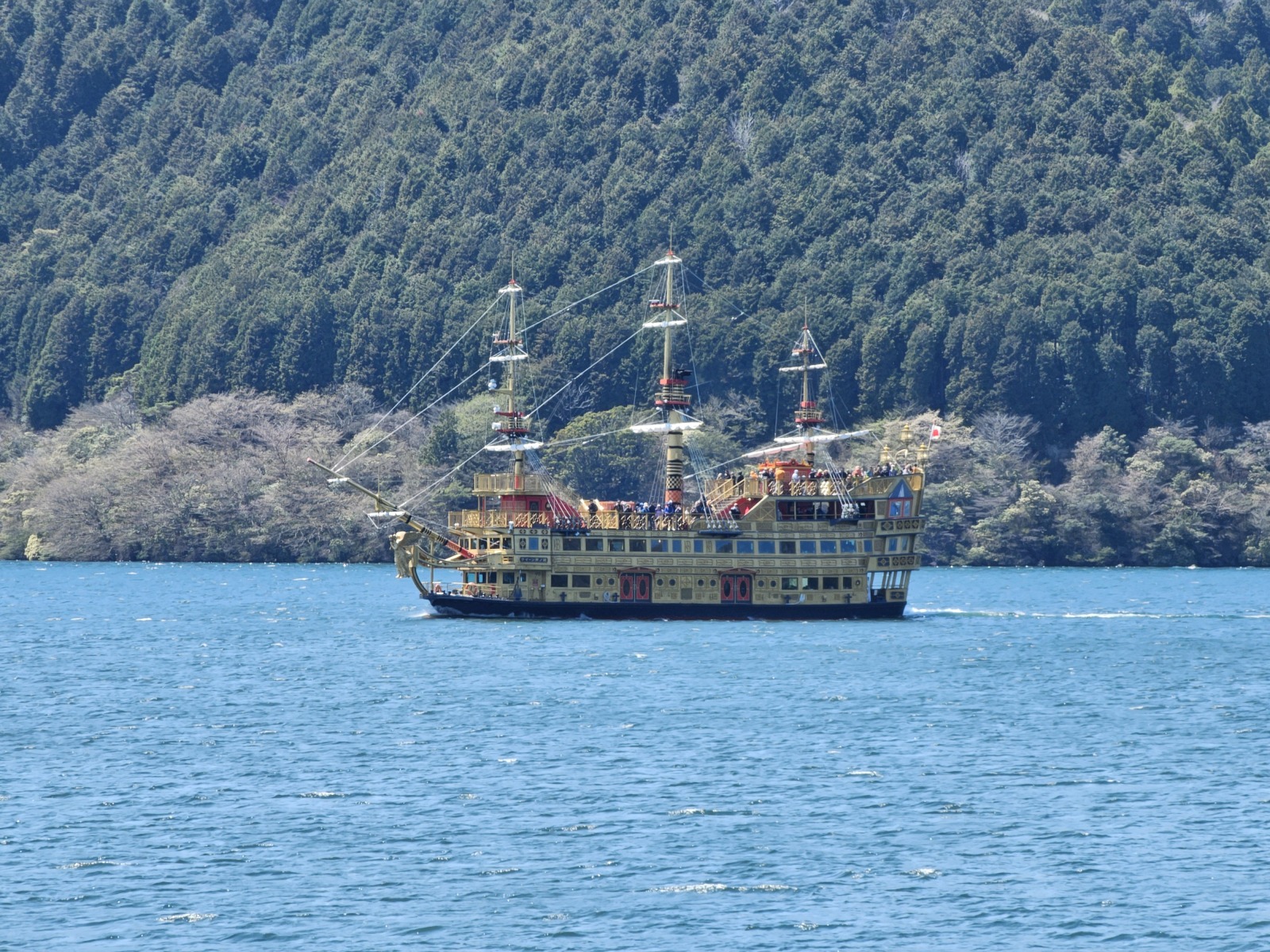 因為事前有聽說過可以在蘆之湖搭海盜船看富士山,以為是整個湖上都看得到富士山,不過因為蘆之湖西邊的山比較高,實際上只有箱根町港和箱根元町這附近的區塊才看得到富士山,而且只有半山腰以上的部分,往桃源台港的方向過去後就看不到了,算是有點失望的地方,不過這也是我事前功課沒做足才抱著期待造成的。扣掉看不太到富士山這點的話,其實蘆之湖的風景還是很不錯的。