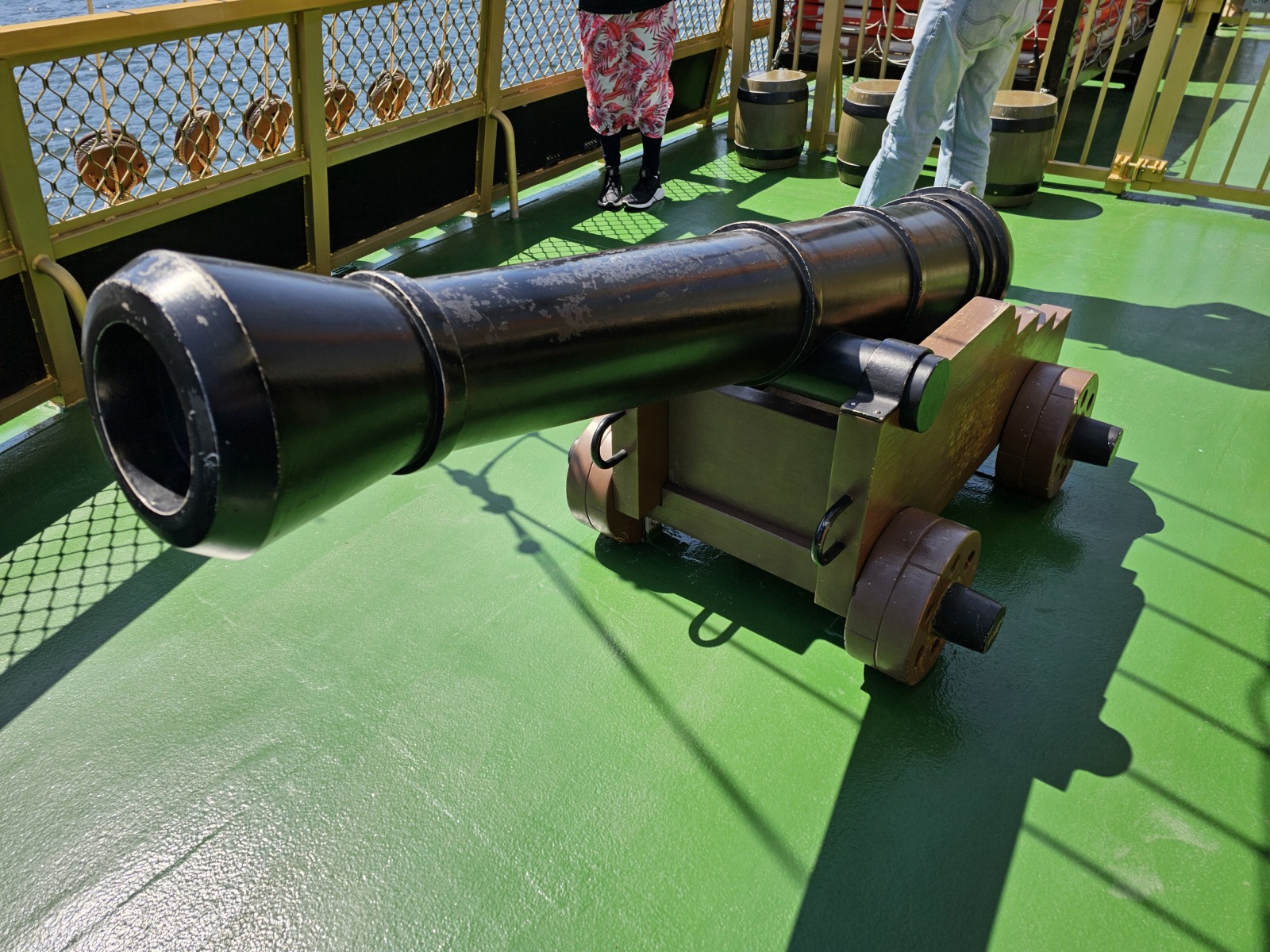 箱根海賊船每艘不同的船都有不同的設計,除了外觀塗裝裝飾不同外,內部的船室也有不同主題,這次搭到的勝利號在官網上看是三艘海賊船裡面相對樸素的一艘,船裡面有寶箱和大砲等裝飾,增加在搭海賊船的感覺。既然難得來了,這次的船票就買了VIP票,可以進到船前方的VIP區,VIP區除了座位比較豪華一些外,上面的甲板區也是VIP專用,因為是在船前方,船行進的時候朝前拍照比較不會被遮擋,另外還有一個小眺望台可以上去,視野會更好。