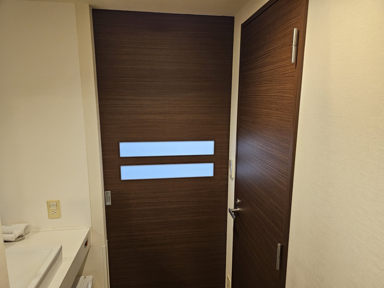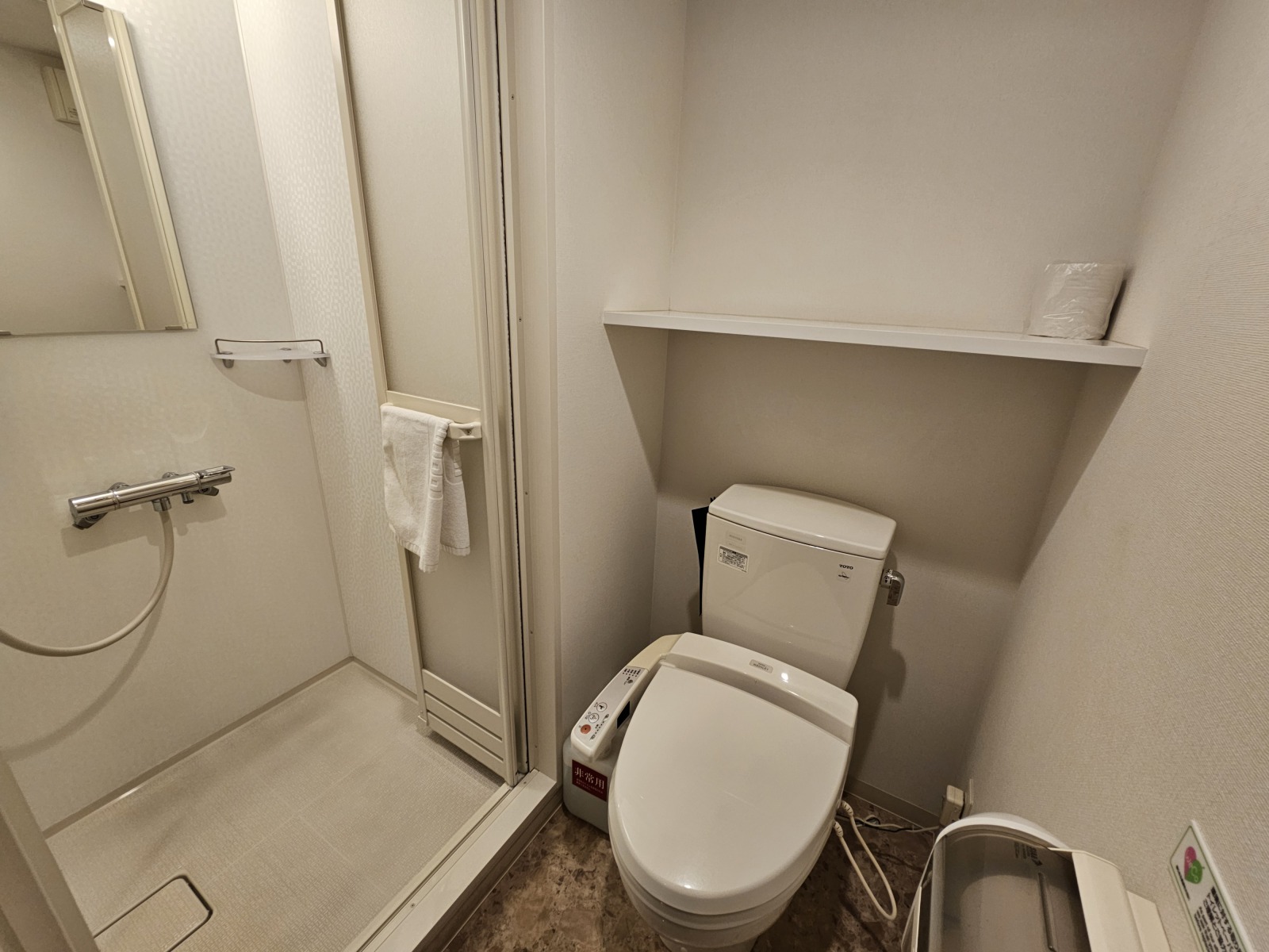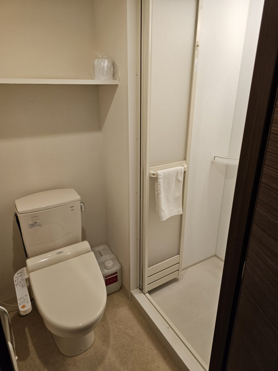 第一次入住的Dormy Inn,房間格局跟一般商務旅館差不多,比較特別的是洗手台是獨立在浴廁外面,不用擔心有人洗澡上廁所會沒辦法洗手,然後盥洗區和房間之間還有一道拉門可以拉起來隔開,另外因為飯店有溫泉大浴場所以只有乾濕分離的淋浴間沒有浴缸。