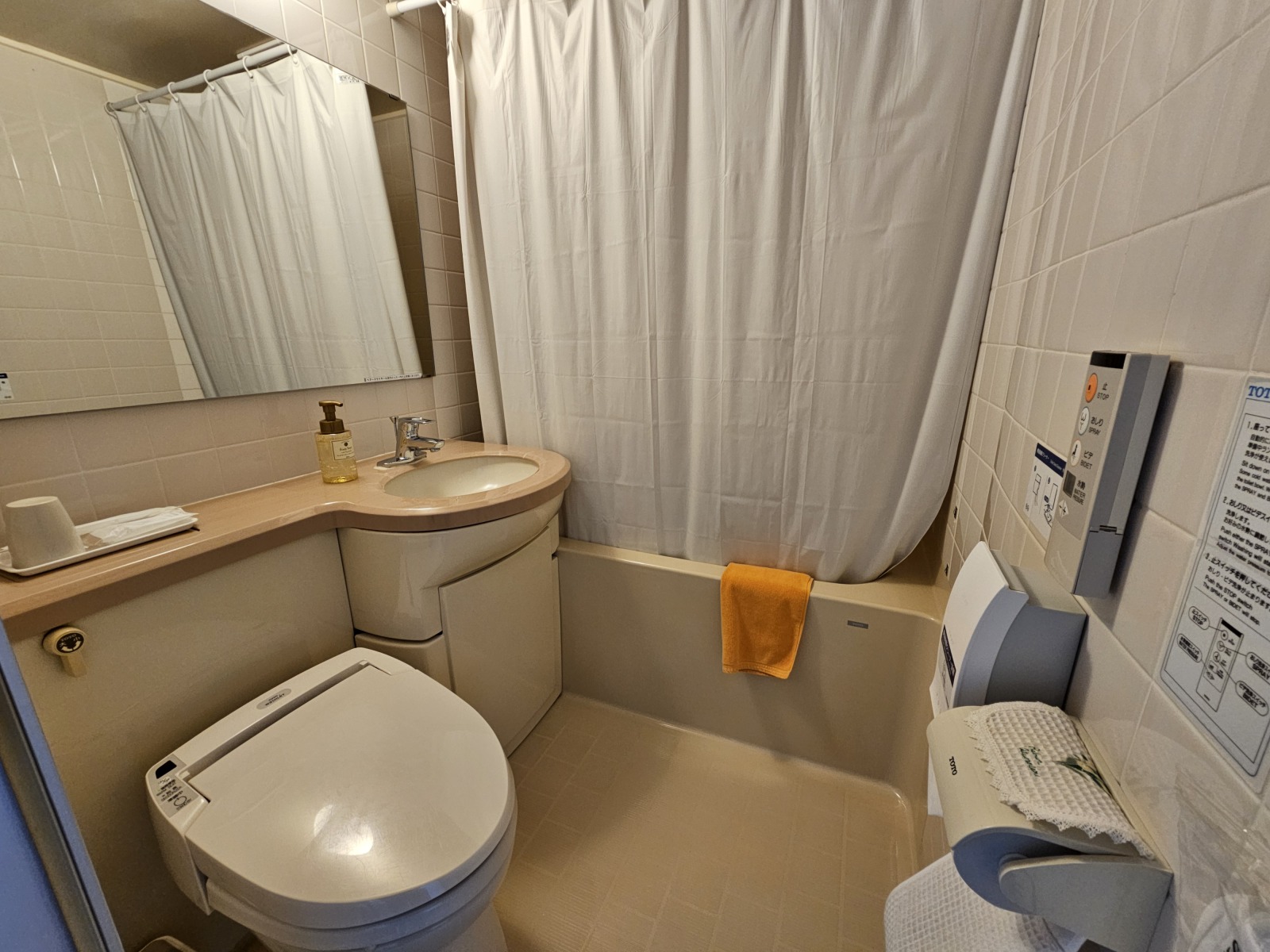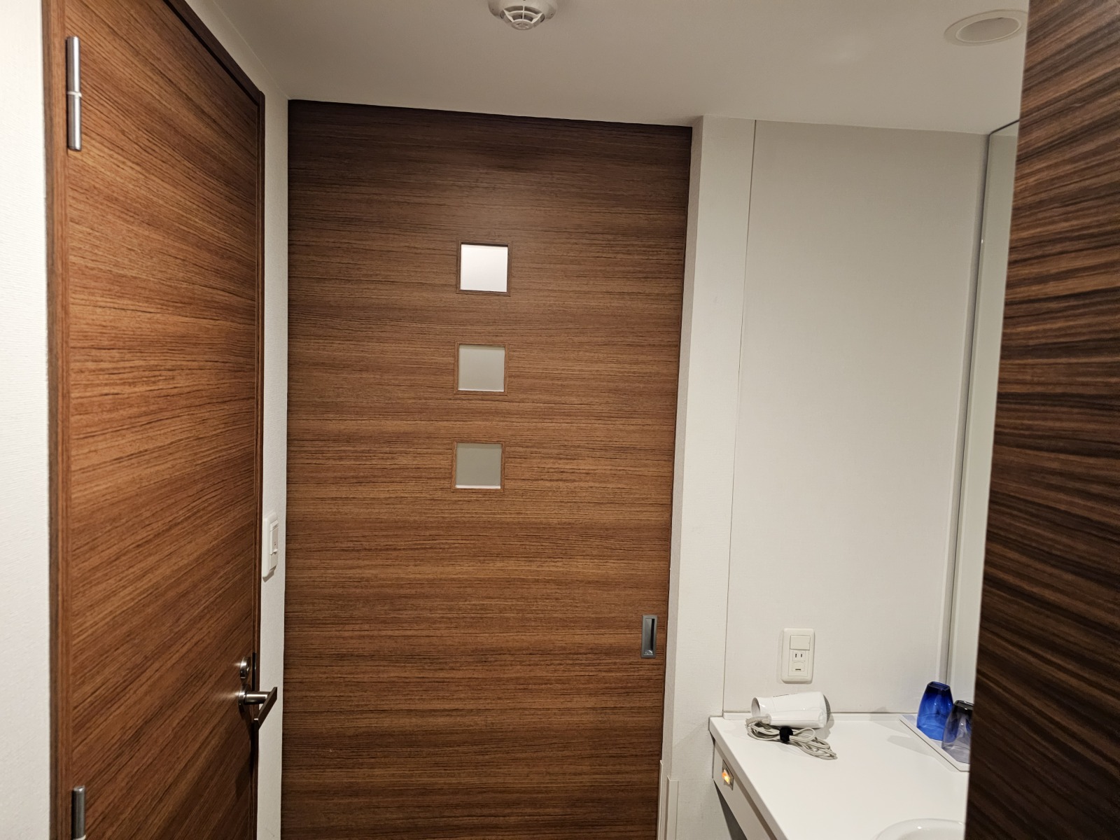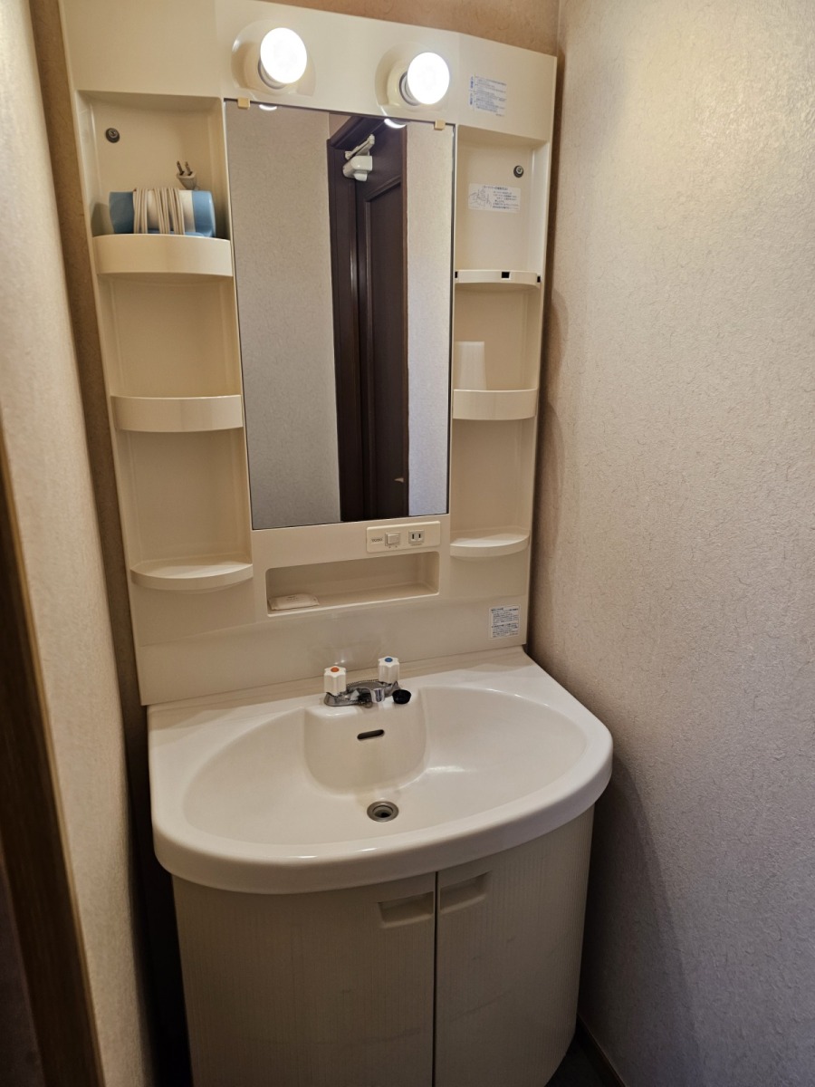 第一次入住的Dormy Inn,房間格局跟一般商務旅館差不多,比較特別的是洗手台是獨立在浴廁外面,不用擔心有人洗澡上廁所會沒辦法洗手,然後盥洗區和房間之間還有一道拉門可以拉起來隔開,另外因為飯店有溫泉大浴場所以只有乾濕分離的淋浴間沒有浴缸。