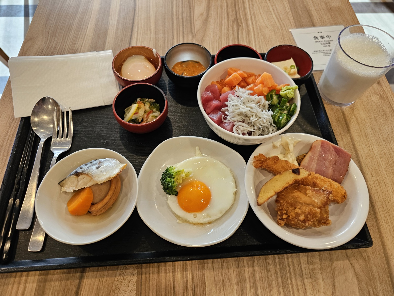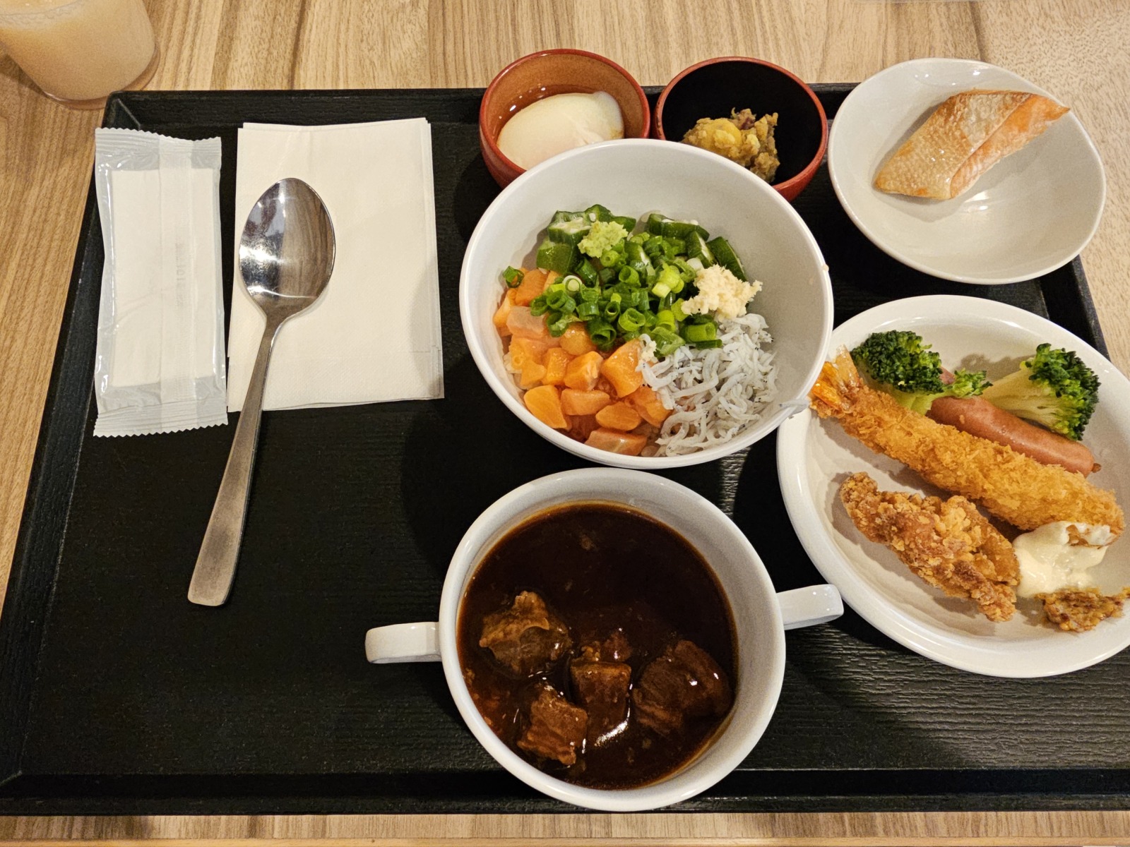 飲食的部分,早餐就有切碎的鮭魚+鮭魚卵、碎鮪魚、吻仔魚等海鮮能吃,熟食的部分也挺不錯的,不同天的早餐也有一些變化,晚上九點半後有Dormy Inn定番的夜鳴拉麵可以吃,內容就是麵、海苔、蔥和湯(這天剛好是十五夜所以多了一片蛋),味道還算可以。樓上有溫泉大浴場,進入需要刷房卡,除了基本的內湯還有氣泡按摩池、露天溫泉(周圍被圍起來只看得到天空)、三溫暖和冷水池等,泡完後外面有冰棒可以隨意吃。