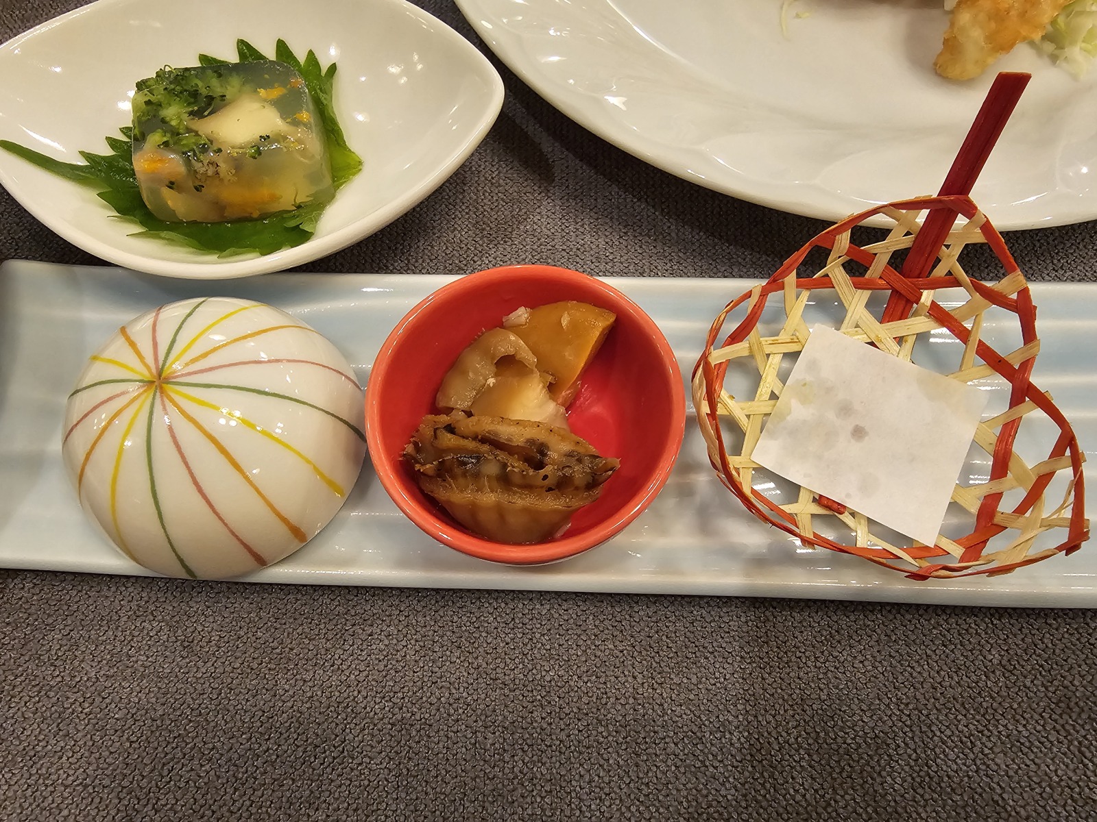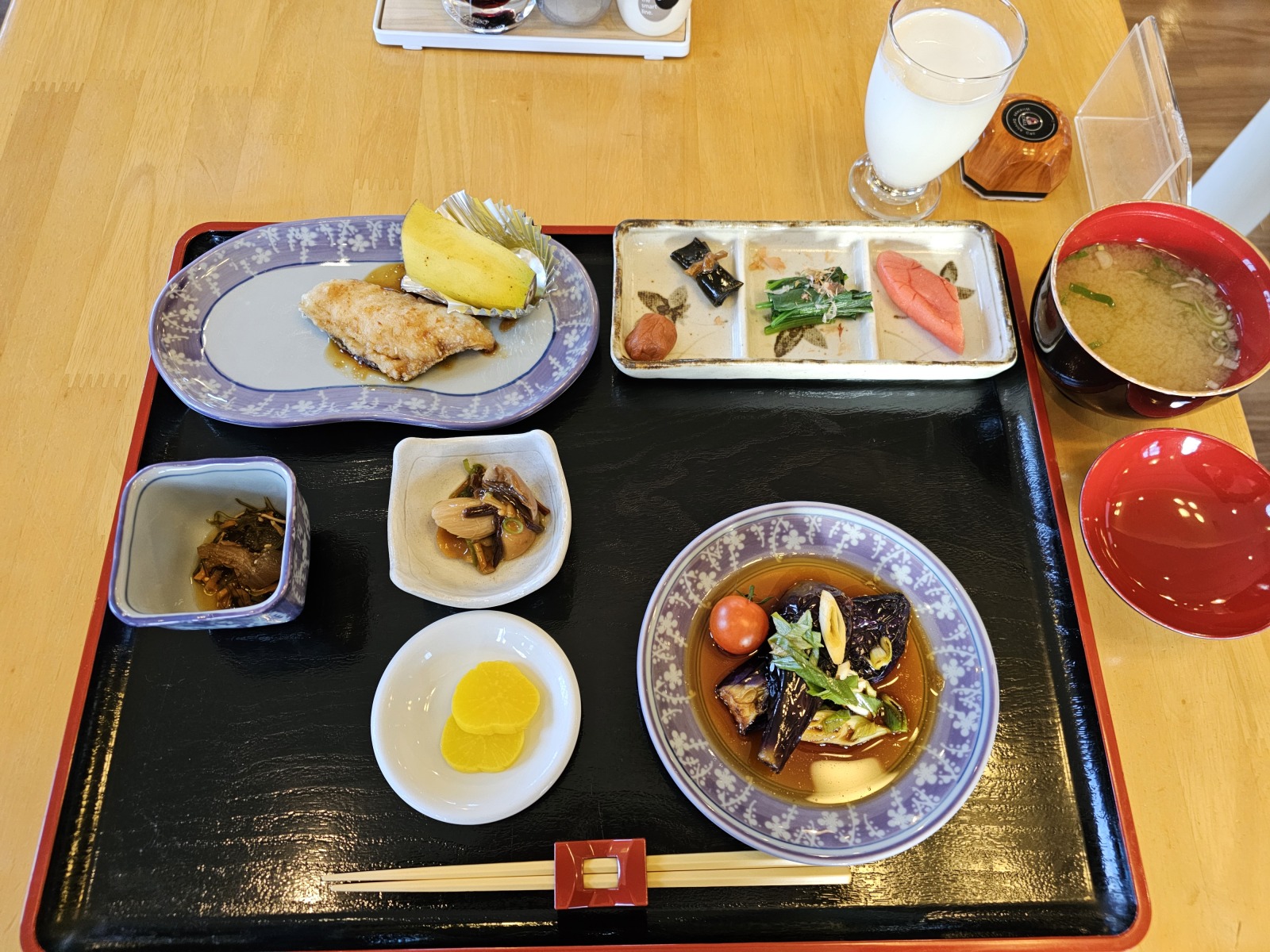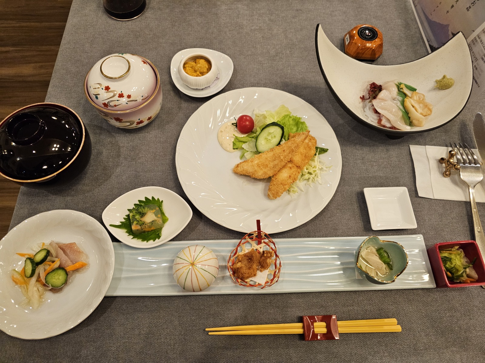 晚餐滿豪華的,因為選的是有海膽的方案,所以有一小缽海膽,還有類似奶油可樂餅的自製特別料理,上面放了一點海膽,旁邊還插上義大利麵做成海膽的形象,白飯和味增湯可以自由裝,餐後的甜點蛋糕非常濃郁綿密,配上咖啡機的拿鐵非常的搭。早餐也算豐盛,除了一樣白飯和味增湯自由裝外還多了牛奶和烏龍茶可裝。