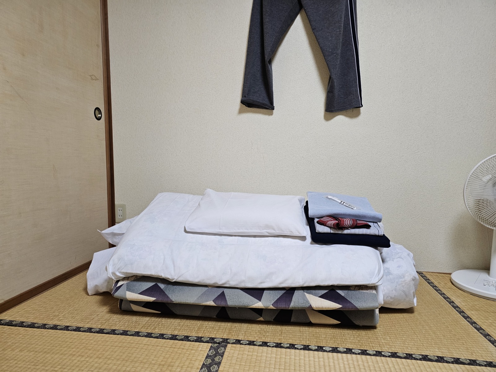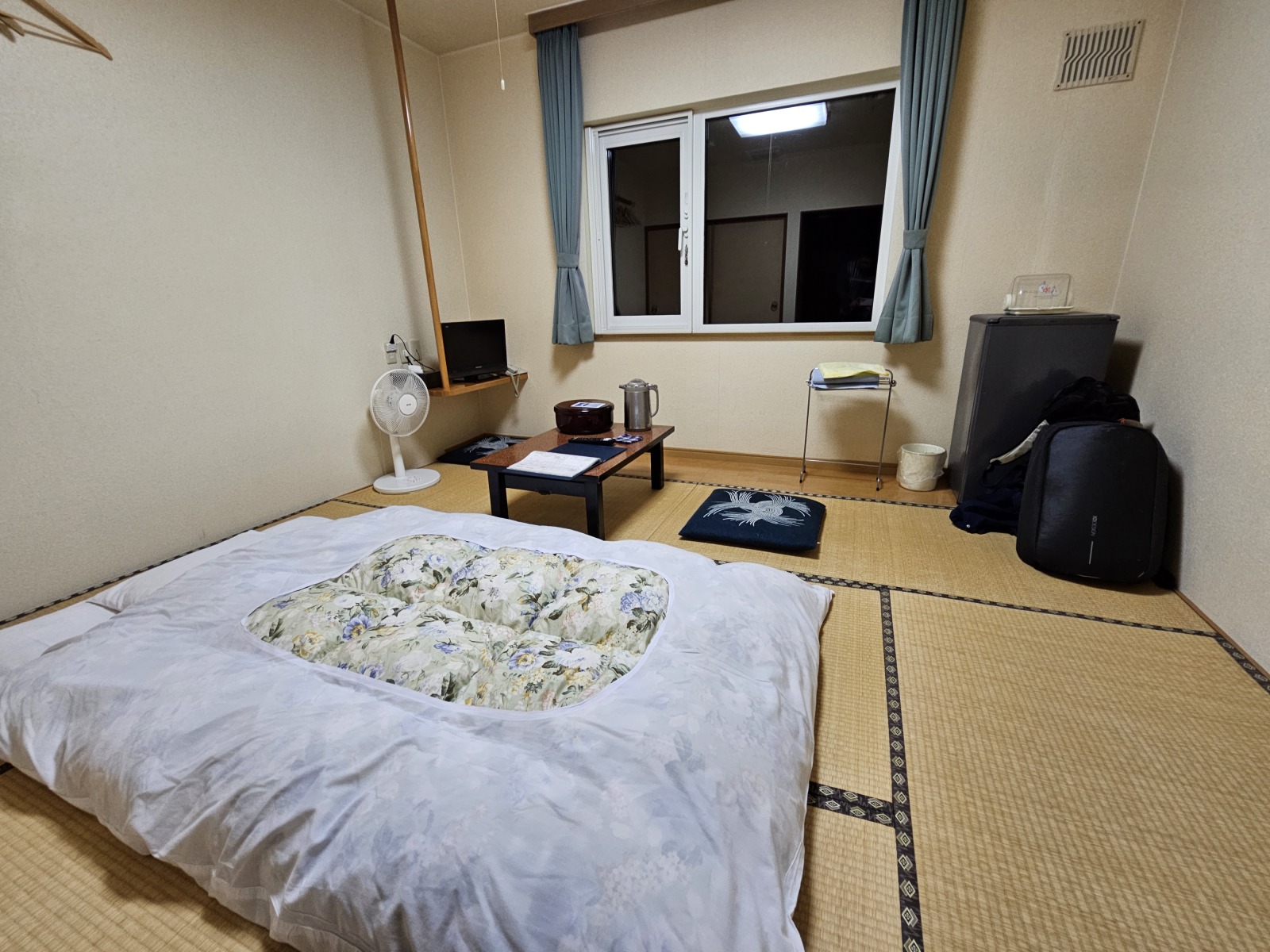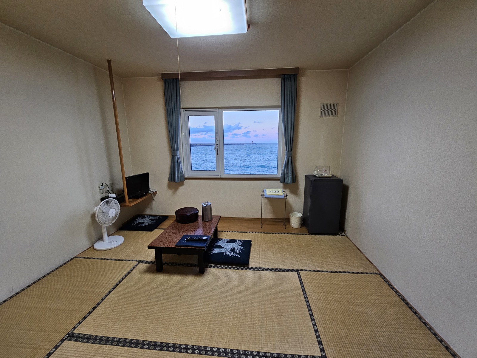 房間是日式榻榻米房,因為也是北方離島,沒有冷氣,只有電風扇。房間沒有廁所和浴室,不過有洗手台,洗澡在一樓的溫泉大浴場,大浴場不大,可能四個人泡就會覺得有點擠,不過我運氣不錯兩晚去洗都沒什麼人。