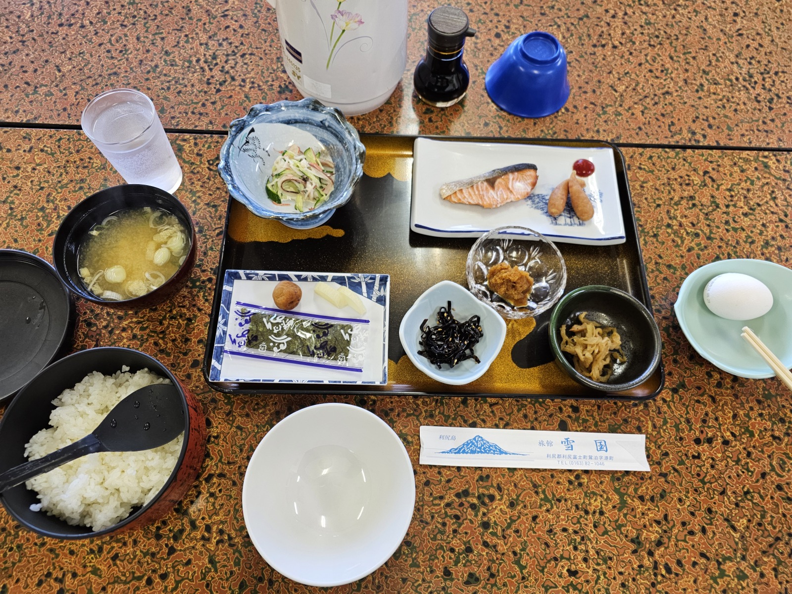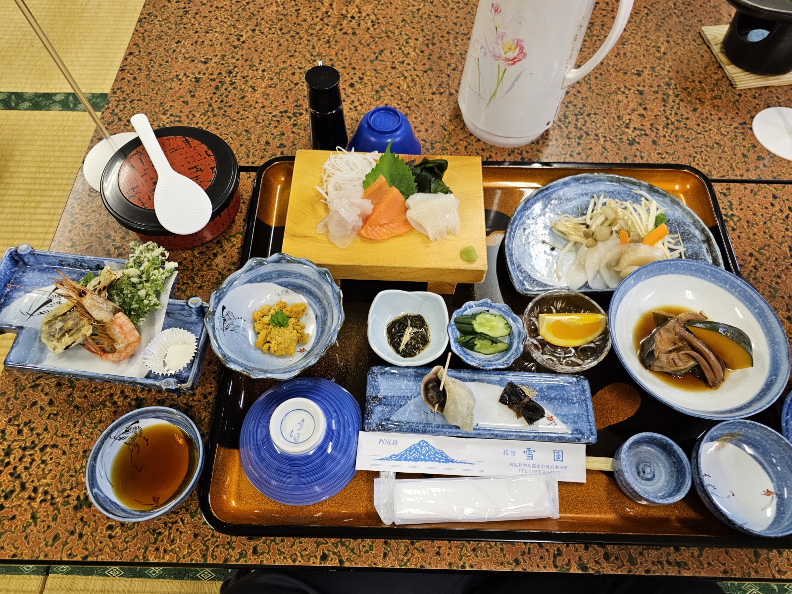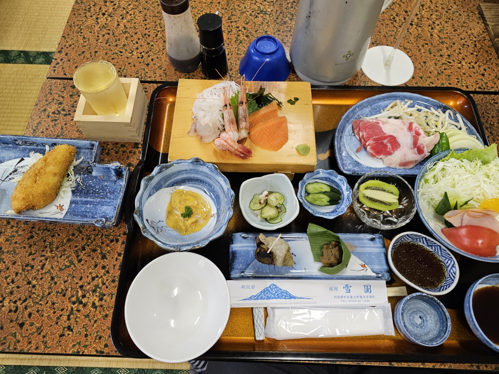 晚餐相當的豪華,有生魚片、海膽(海膽季如果過了就沒了)、鐵板燒、炸物等等,而且兩天的餐點都有變化,其中一天額外加點了利尻的地酒-麗峰の雫,是用當地的融雪湧泉來釀造的日本酒,喝起來有種甘甜感,非常好喝!早餐也算不錯,不過變化比較少。這次還遇到了在這邊度假打工的台灣女生,一開始聽到中文還有點意外,也感謝她親切的跟我介紹餐點和利尻的一些特色。吃完晚餐回房後跟其他日式旅館一樣會幫忙鋪好床,第二天的話就是把寢具整理好摺疊起來,直接拉開就可以睡。