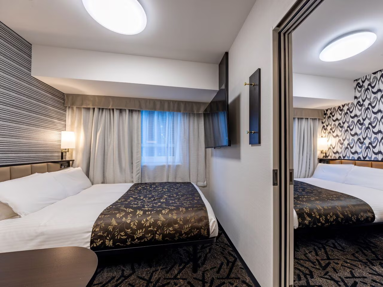 這是我第一次住APA Hotel,這間APA Hotel是去年12月才開幕的,裡面設備相當的新,事前有看過各家平價商務旅館的比較,大概知道APA Hotel的特色,一進大廳就是相當光華亮麗的風格,這次入住的是連通房,是兩間雙人房中間有門可以打開互通,根據連通的房型分為S-S(標準房)和T-T(雙床房)兩種,T-T房型價格貴上S-S不少,因為只有短短住一晚就選了S-S連通房。