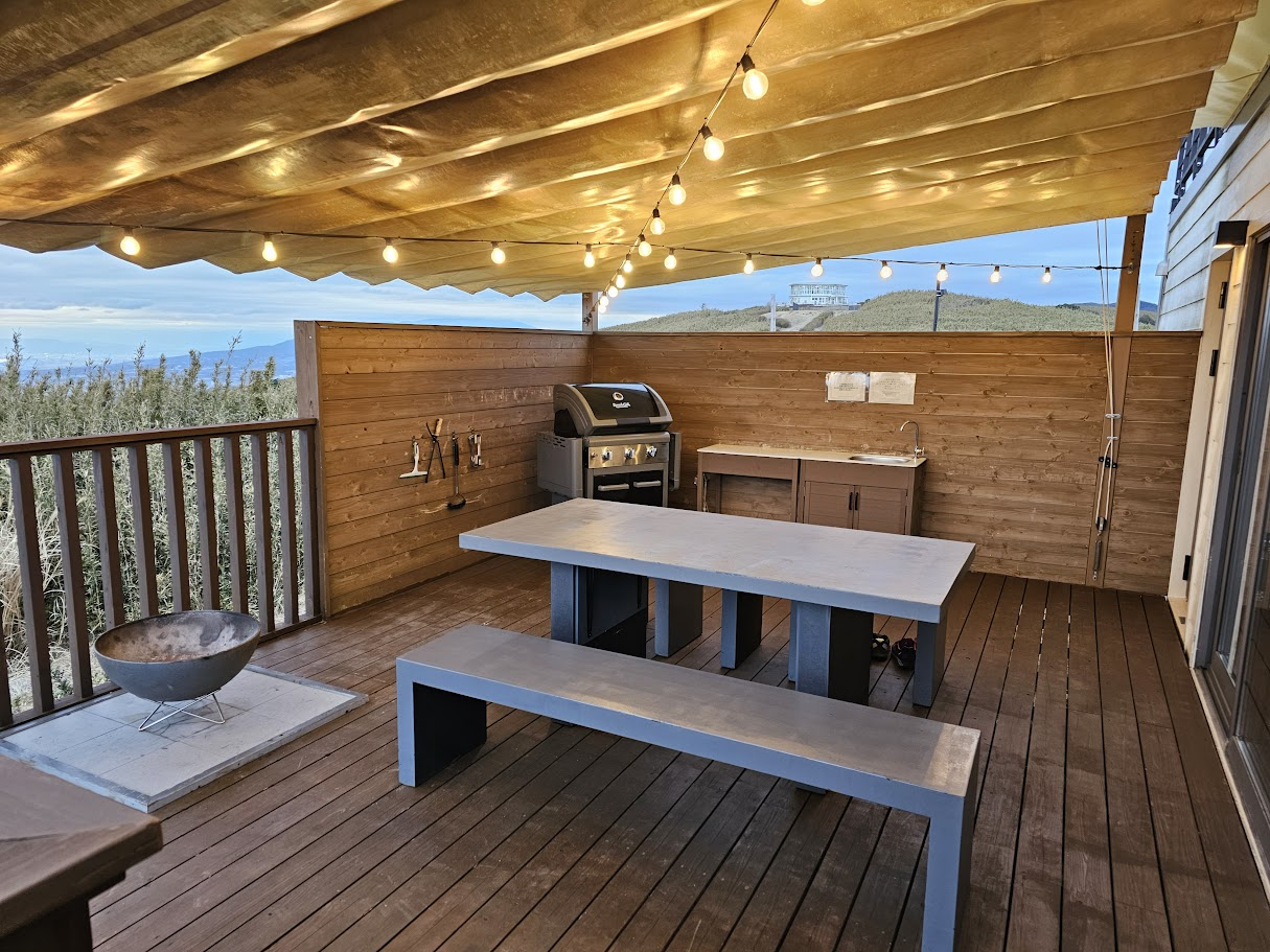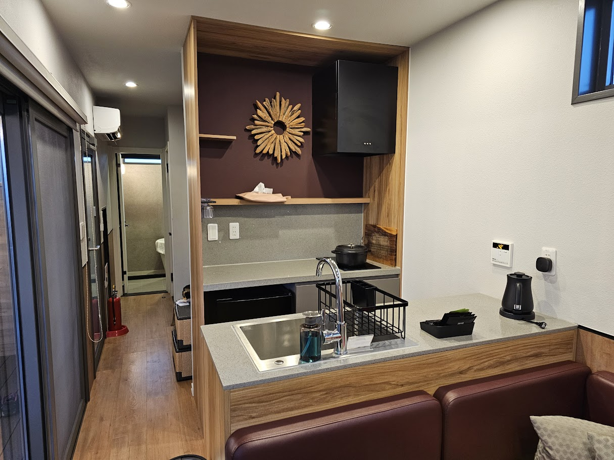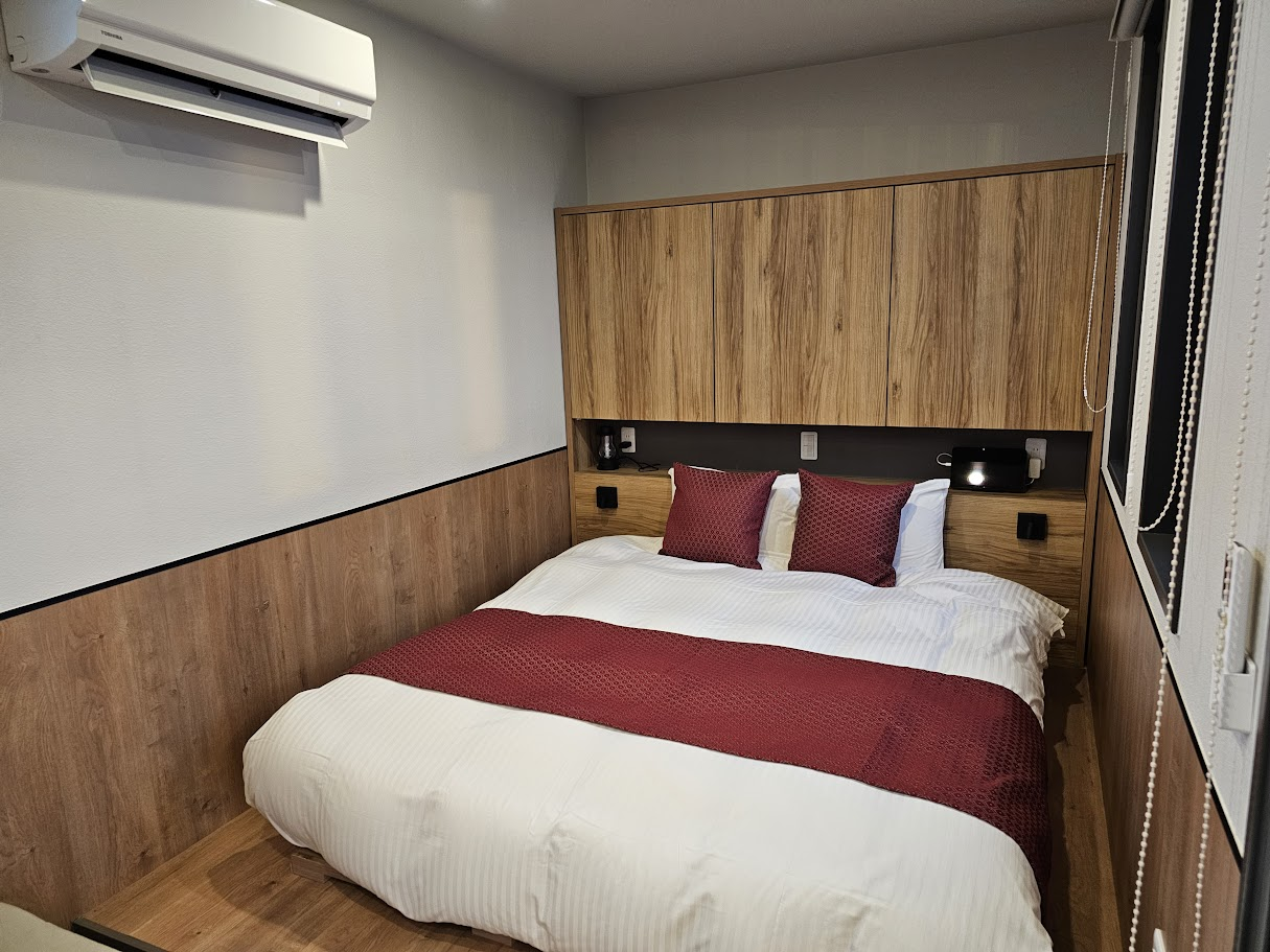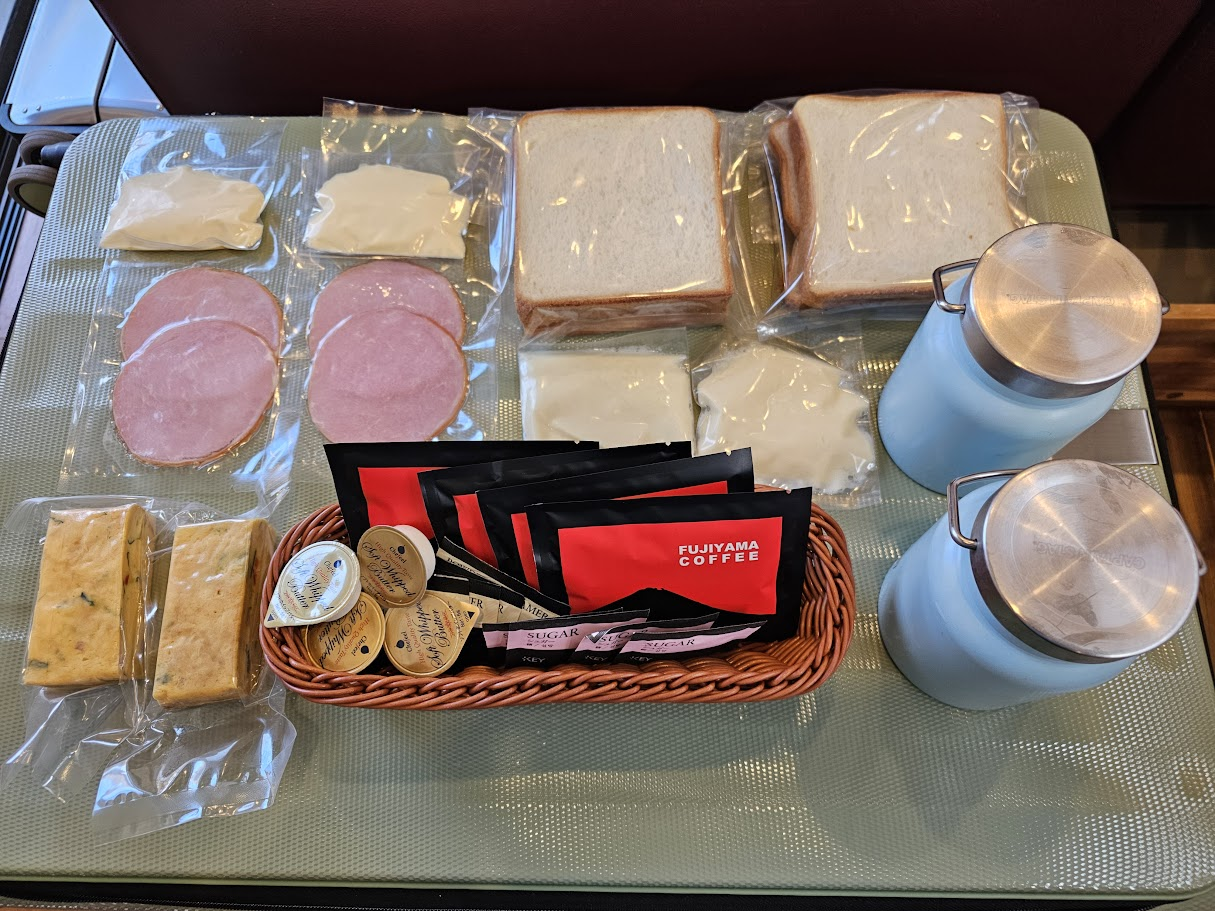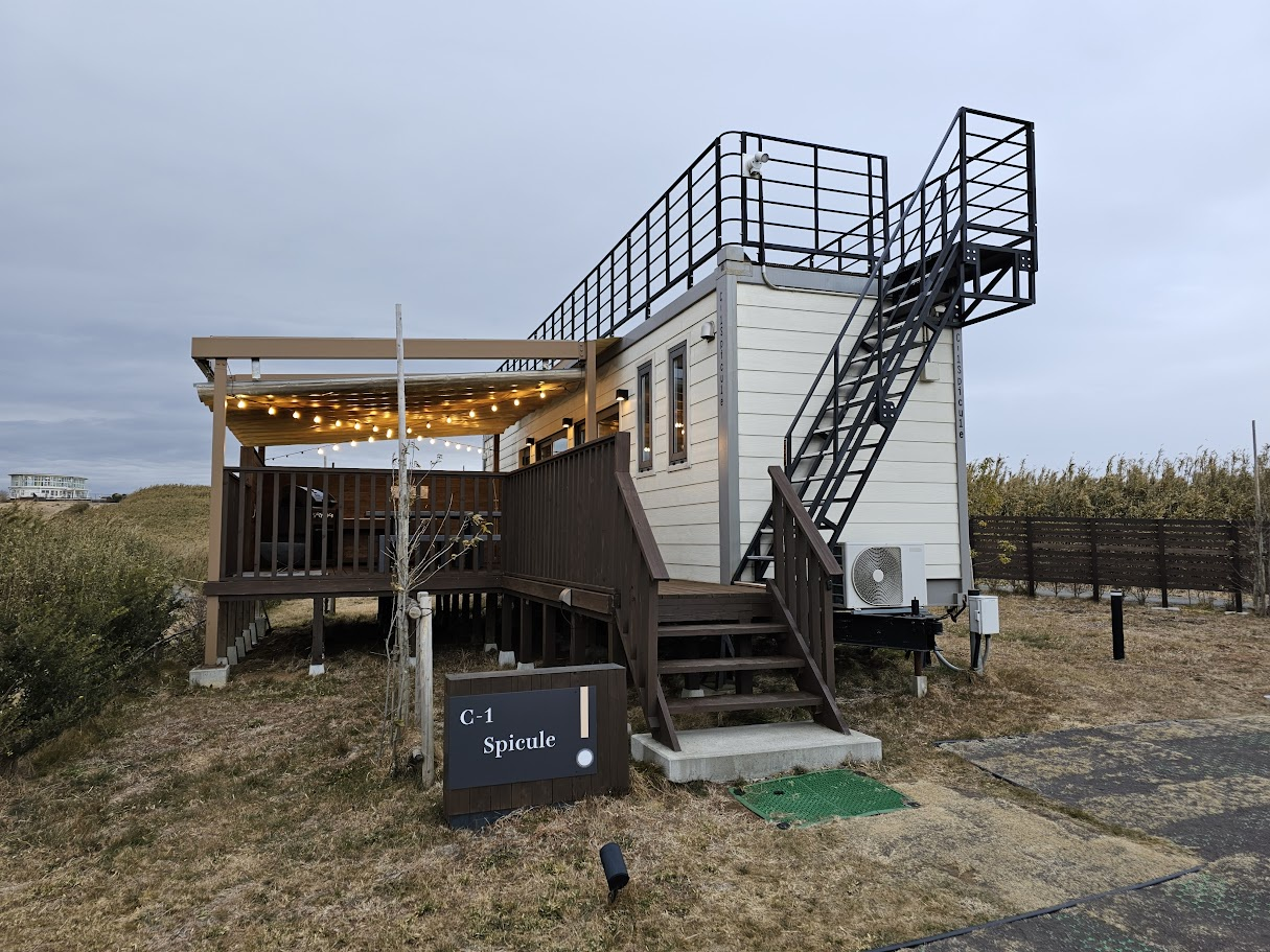 這個豪華露營區在十國峠纜車站的附近,是同個團隊營運的,所以住客可以免費搭纜車上下,在纜車站的名產店消費也能打九折,不過Check-In是在露營區內不是在纜車站,所以還是得先上到露營區,往露營區的路有一段很窄,開大車可能會不太好上來。這次入住的是最基本的房型Sky Deck,外觀看來有點像是拉長了的貨櫃屋,裡面有一張雙人床和一個上下舖床,還有個L型沙發椅、桌子、廚房、分離的廁所和浴室等,因為各設施都佔了不少空間,剩下的空間並不算大,開行李箱的時候需要橋空間,外面則有一個露臺,露臺有個調理區、桌椅、瓦斯BBQ爐、焚火爐,另外還有個樓梯可以上去屋頂眺望風景,所以叫做Sky Deck,更大間的房型就沒有樓梯可以上屋頂。
