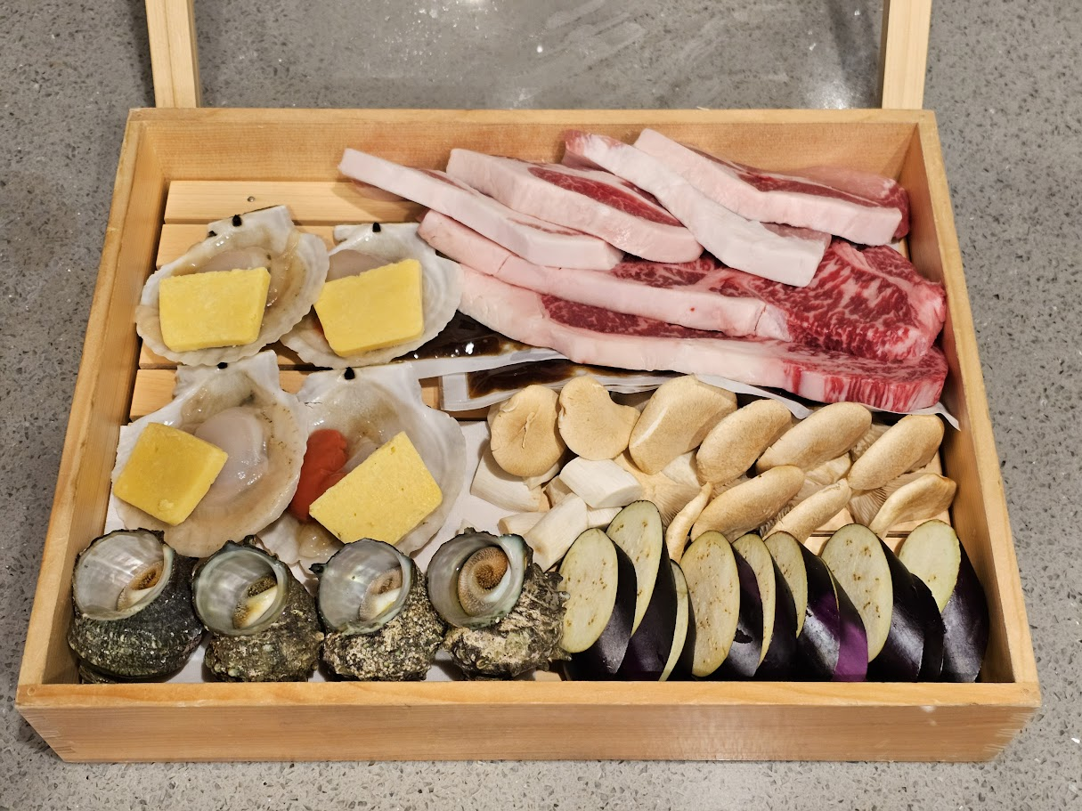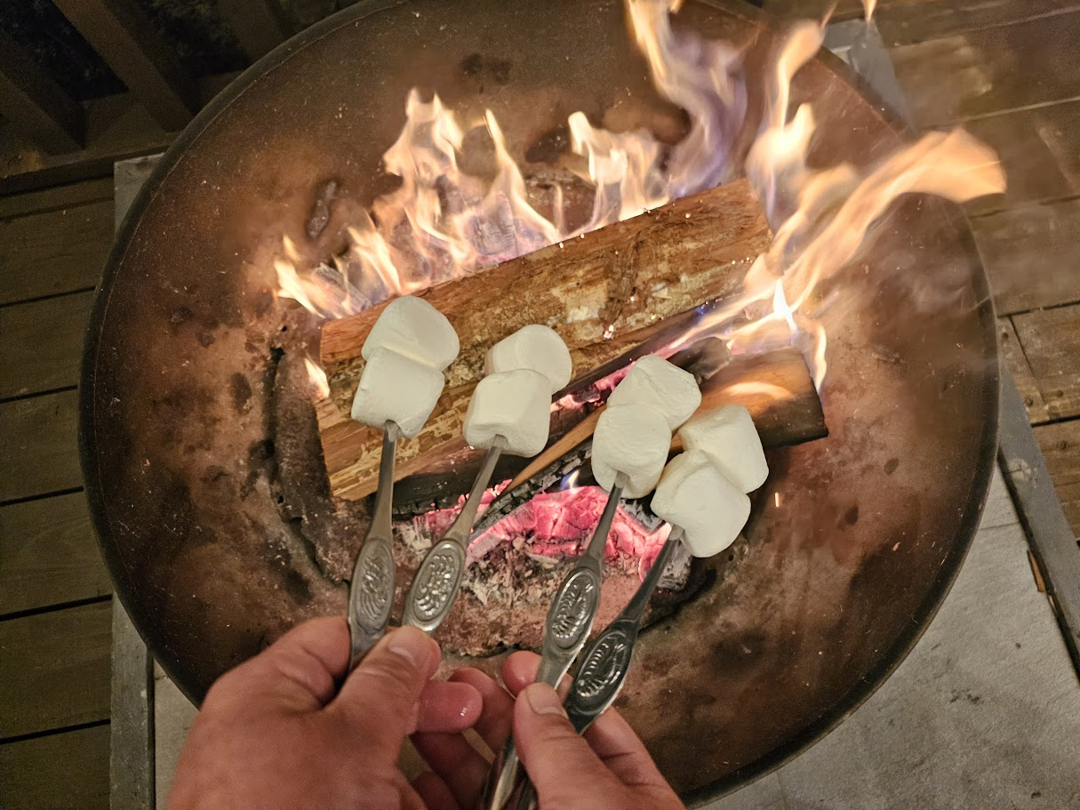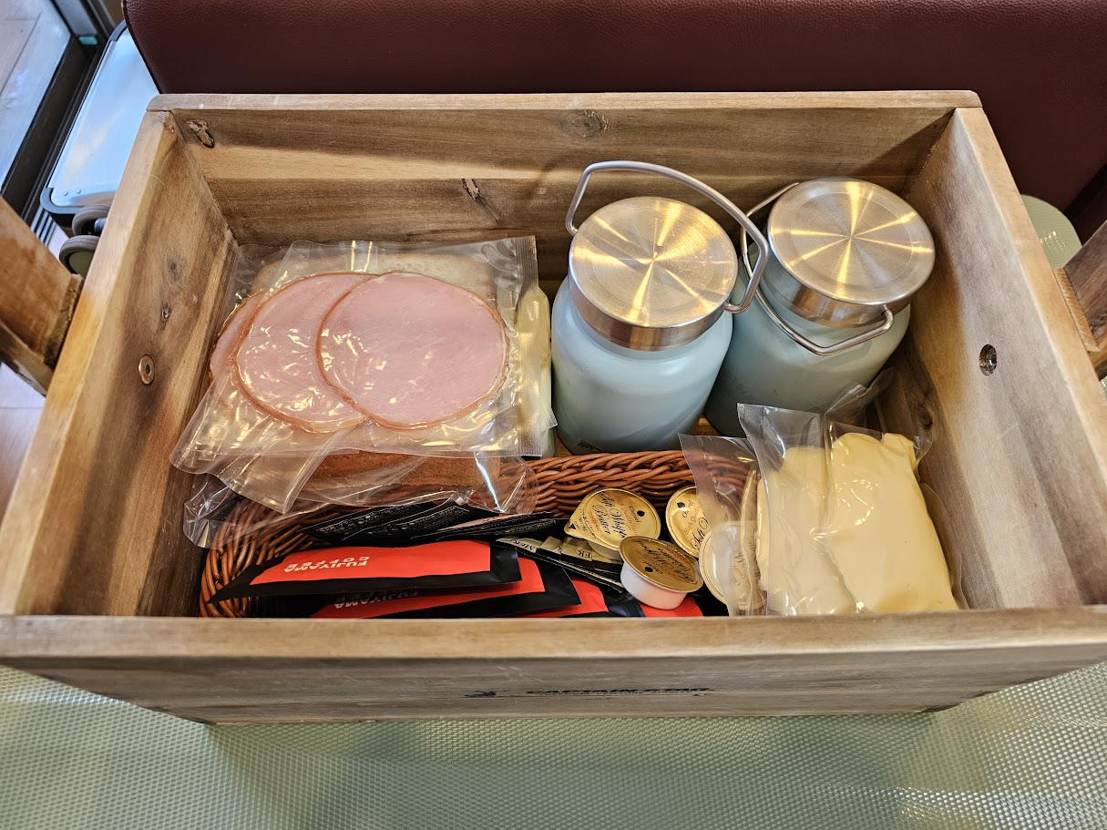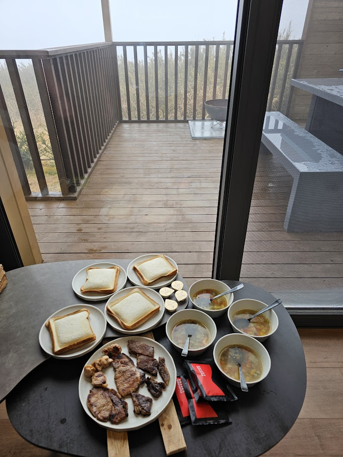 餐點的部分有附兩餐,會由工作人員送過來,晚餐食材非常的豪華,而且會隨季節變化,這次的是冬季食材,有前菜、豬、牛、雞、蔬菜、海鮮、豆漿鍋、吃完火鍋後拿來煮粥的米飯、甜點的棉花糖餅乾等,有些拿到外面的BBQ烤爐去烤,有的在屋內用電磁爐煮,煮出來的份量還挺多的,我們家人四個一次吃不完還留了一些當消夜和第二天早餐。早餐則是簡單的熱壓吐司和蔬菜湯,把給的料和醬夾好後用熱壓三明治鍋夾起來加熱一段時間就能吃了。