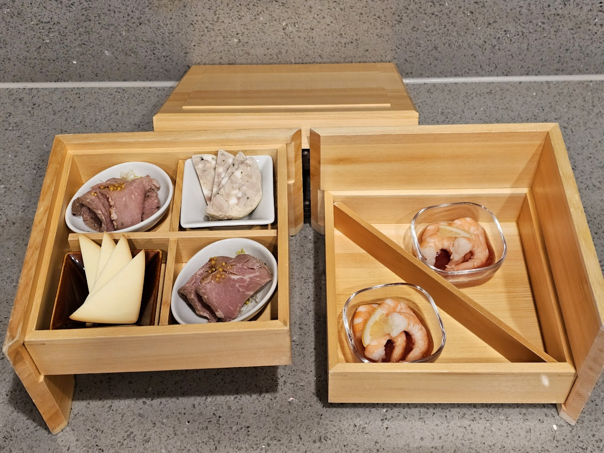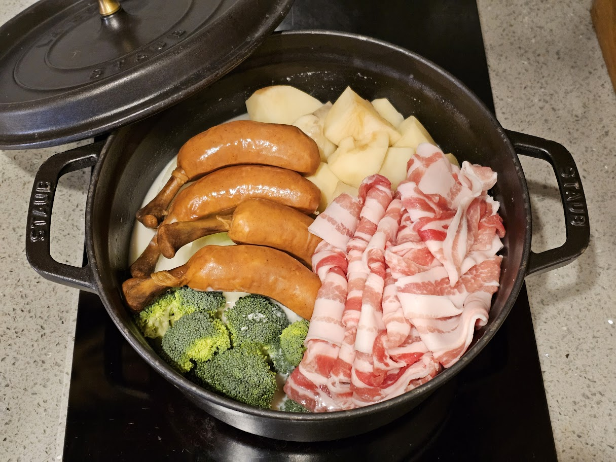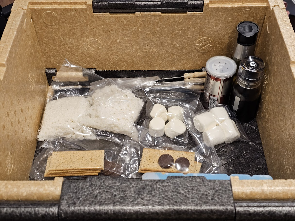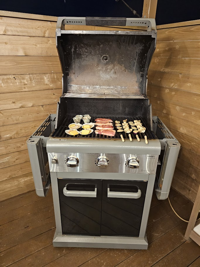 餐點的部分有附兩餐,會由工作人員送過來,晚餐食材非常的豪華,而且會隨季節變化,這次的是冬季食材,有前菜、豬、牛、雞、蔬菜、海鮮、豆漿鍋、吃完火鍋後拿來煮粥的米飯、甜點的棉花糖餅乾等,有些拿到外面的BBQ烤爐去烤,有的在屋內用電磁爐煮,煮出來的份量還挺多的,我們家人四個一次吃不完還留了一些當消夜和第二天早餐。早餐則是簡單的熱壓吐司和蔬菜湯,把給的料和醬夾好後用熱壓三明治鍋夾起來加熱一段時間就能吃了。