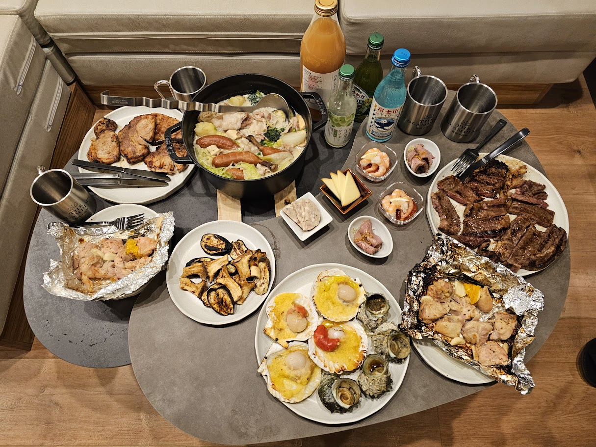 飲食方面,營區沒有提供餐點,必須要自行解決,不過開車到河口湖對面約5~10分鐘車程的地方就有3.4間以上的超市,這次住的三天每天都去不同的超市採買熟食和食材回來吃,河口湖附近也不缺各種飲食店。